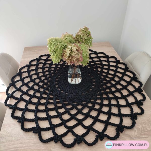 Ażurowa Serwetka o średnicy 90 cm, wykonana metodą szydełkowania z polskiego sznurka bawełnianego 5mm. Świetna do każdego wnętrza. Pięknie ozdobi stół w salonie lub jadalni, a także mniejsze stoliki kawowe i czytelniane. W przypadku zabrudzenia jest łatwa w utrzymaniu w czystości. Można prać w pralce w 30 stopniach i wirować. Suszyć należy rozłożoną na płasko.