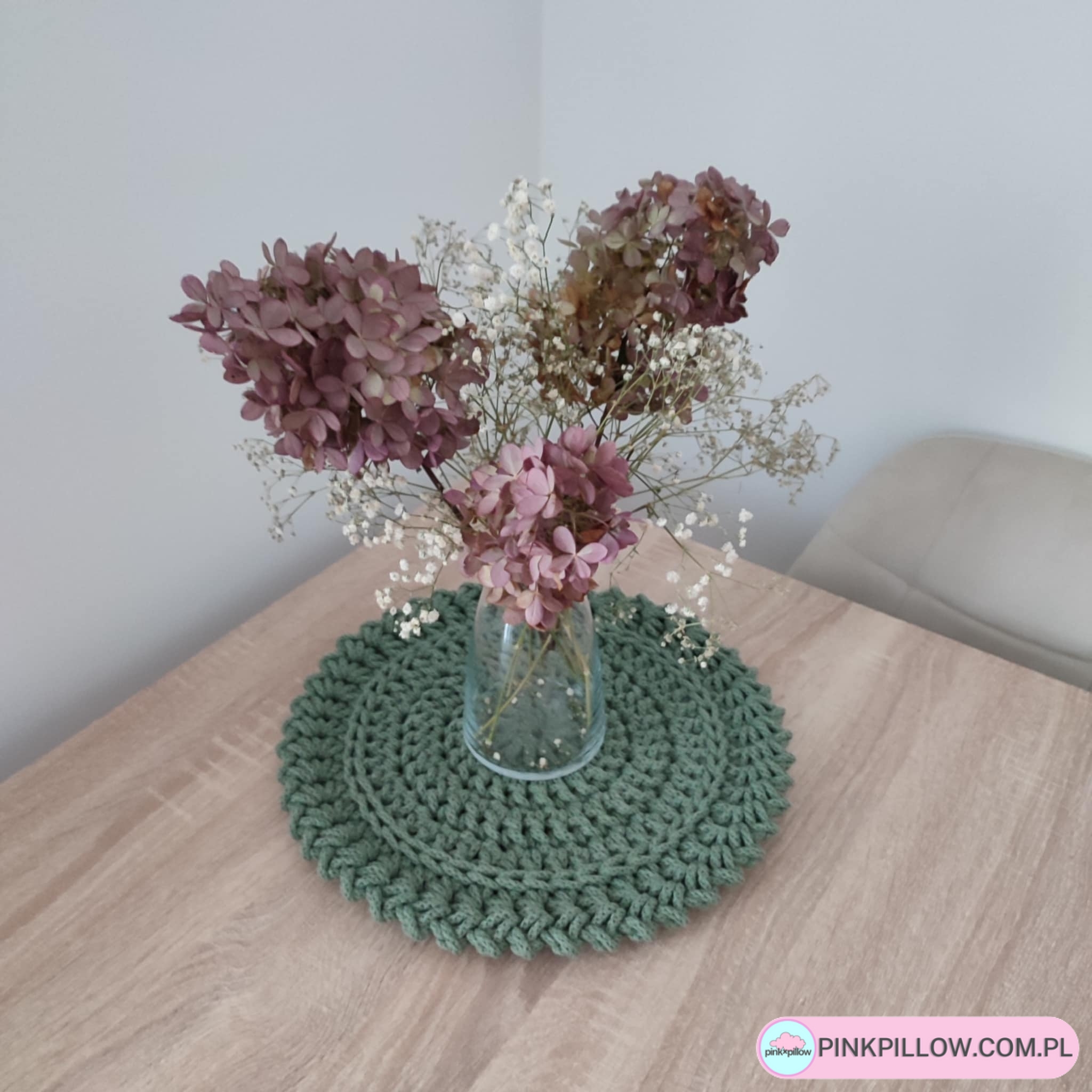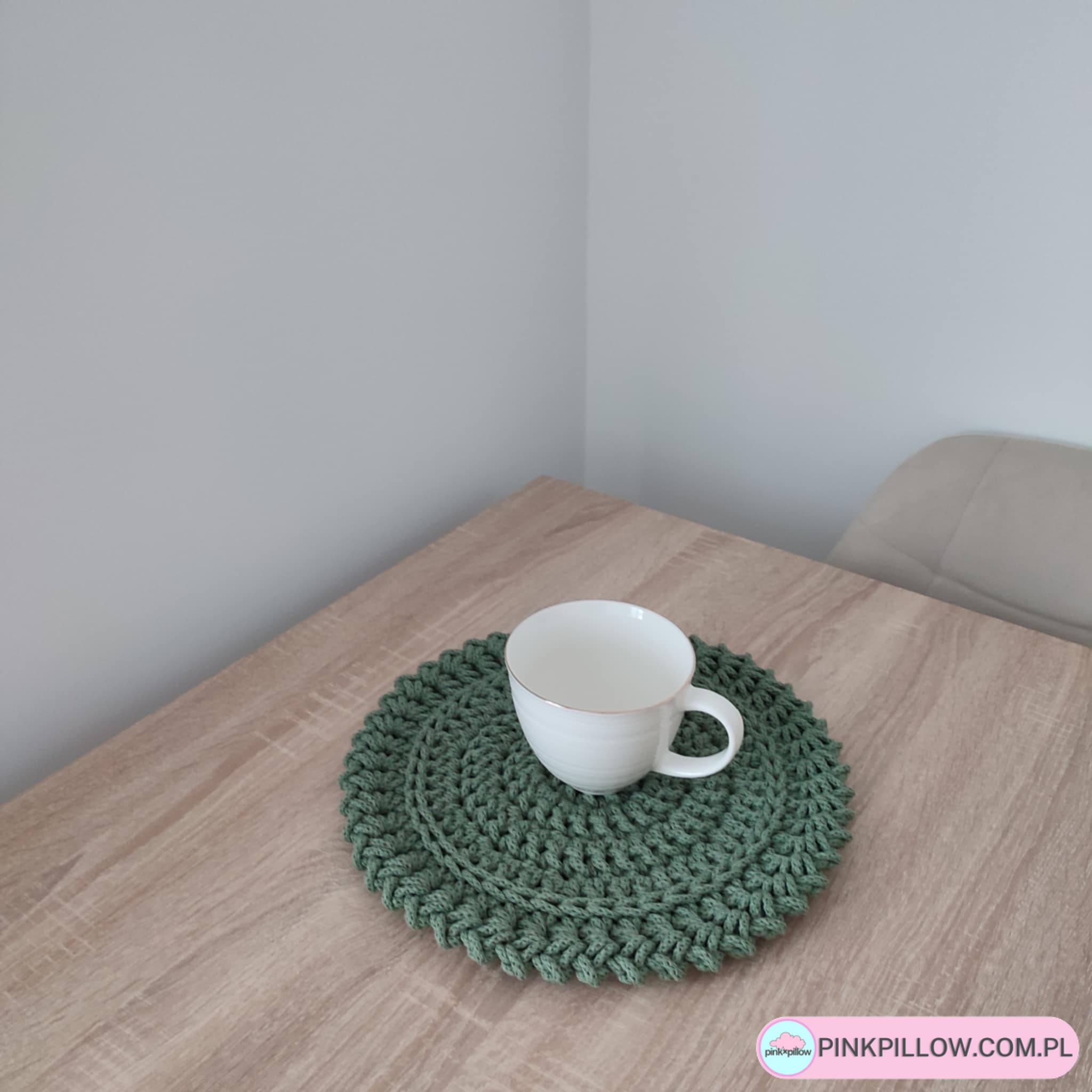 Bawełniana, Okrągła podkładka o średnicy 32 cm, wykonana metodą szydełkowania z polskiego sznurka bawełnianego 5mm. Idealna na stół pod talerze lub kubki, sprawdzi się w kuchni lub jadalni. Można wykorzystać jako element dekoracji na stolik kawowy, komodę, lub inny mebel. Jest łatwa w utrzymaniu w czystości, można prać w pralce w 30 stopniach i wirować. Suszyć należy rozłożoną na płasko.