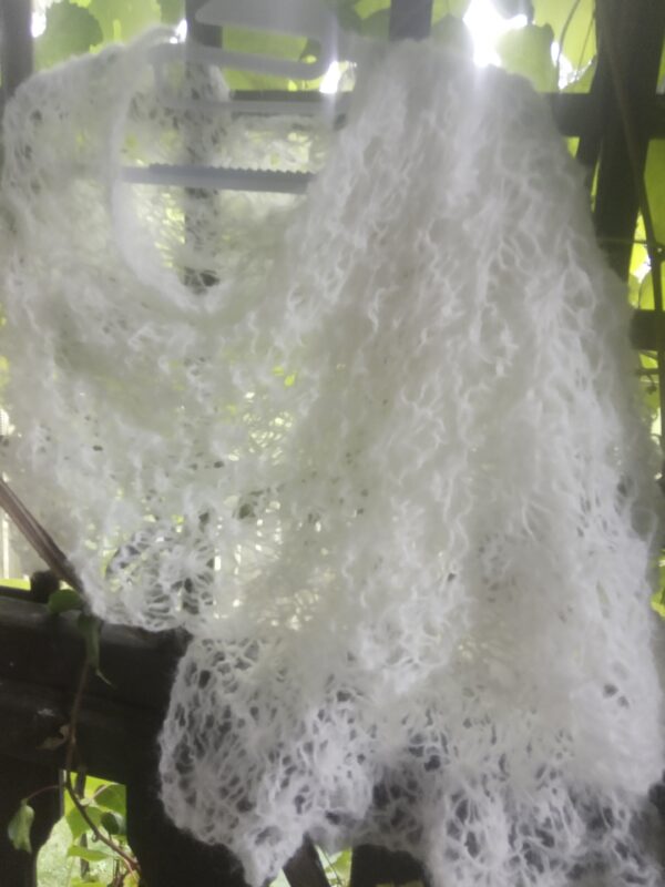 Biała narzutka do sukienki w całości wykonana ręcznie na drutach pięknym siateczkowym wzorem. Jest bardzo delikatny, leciutki i puszysty. Będzie doskonałym dodatkiem ślubnym, wieczorowym lub codziennym w formie narzutki na sukienkę. Ozdobi każdą stylizację, a jej plastyczność oraz rozciągliwość, sprawia że można nosić ją na różne sposoby.