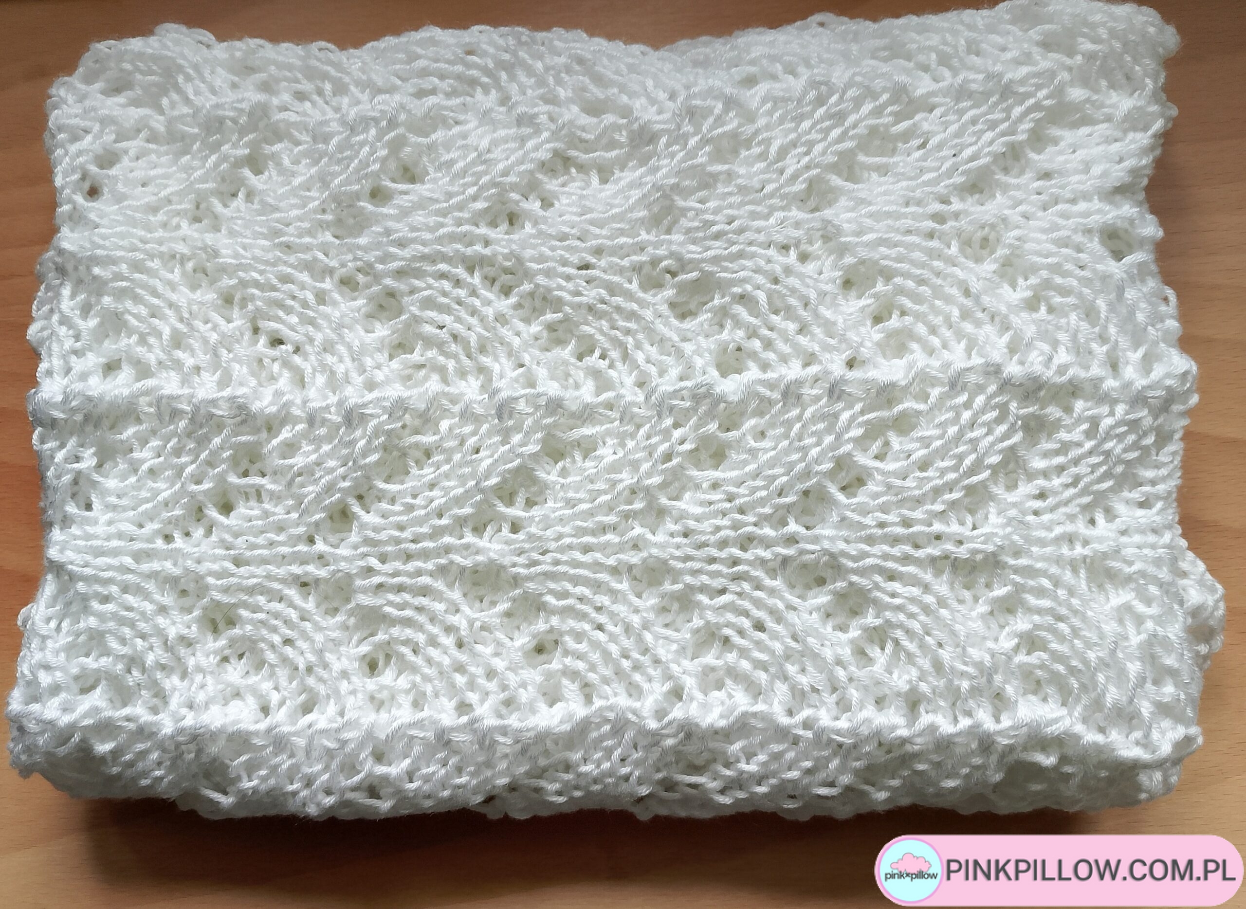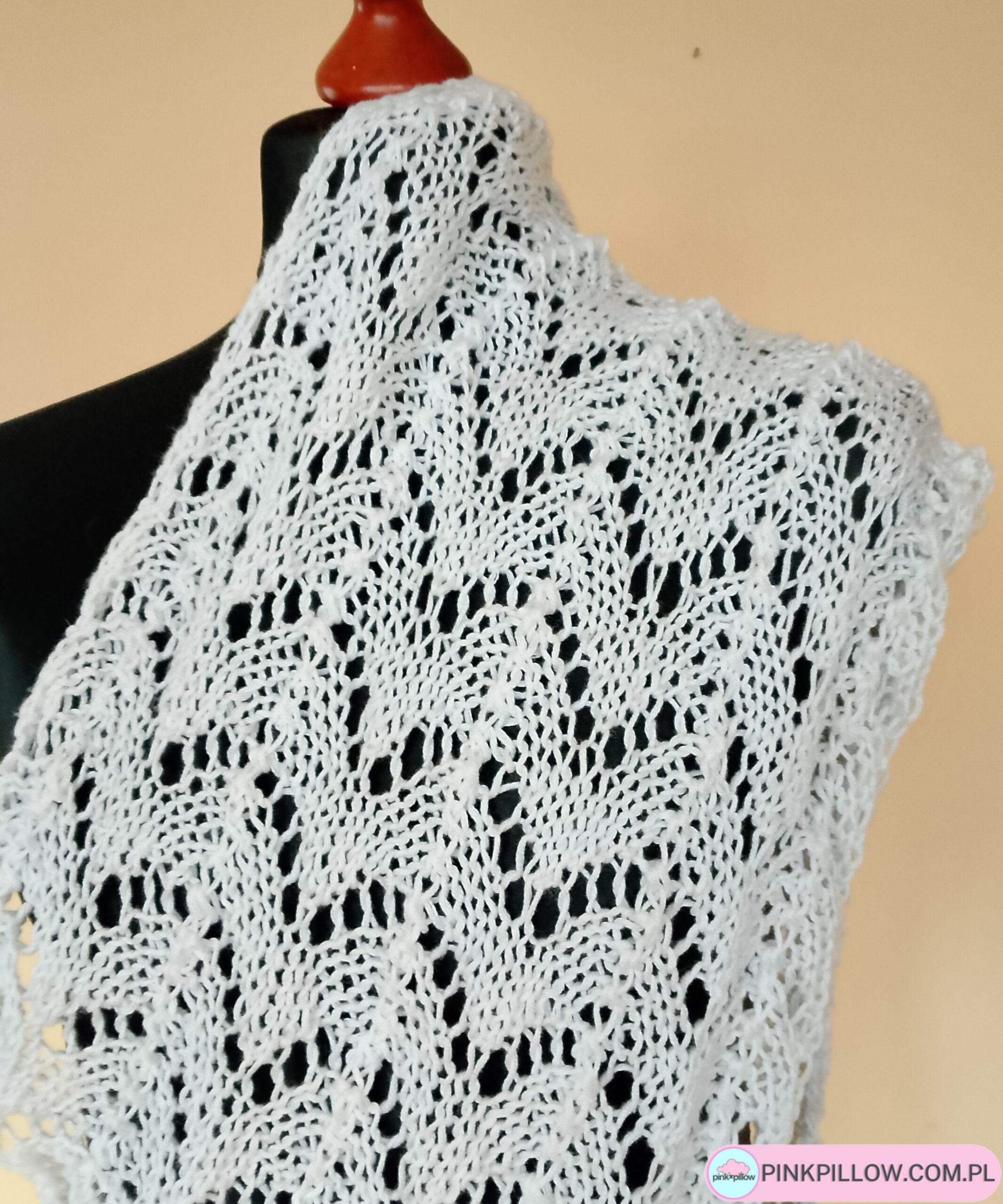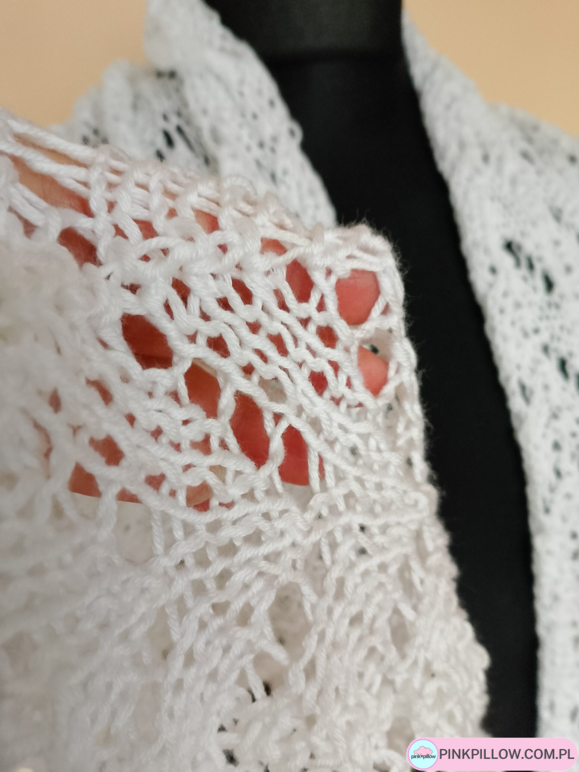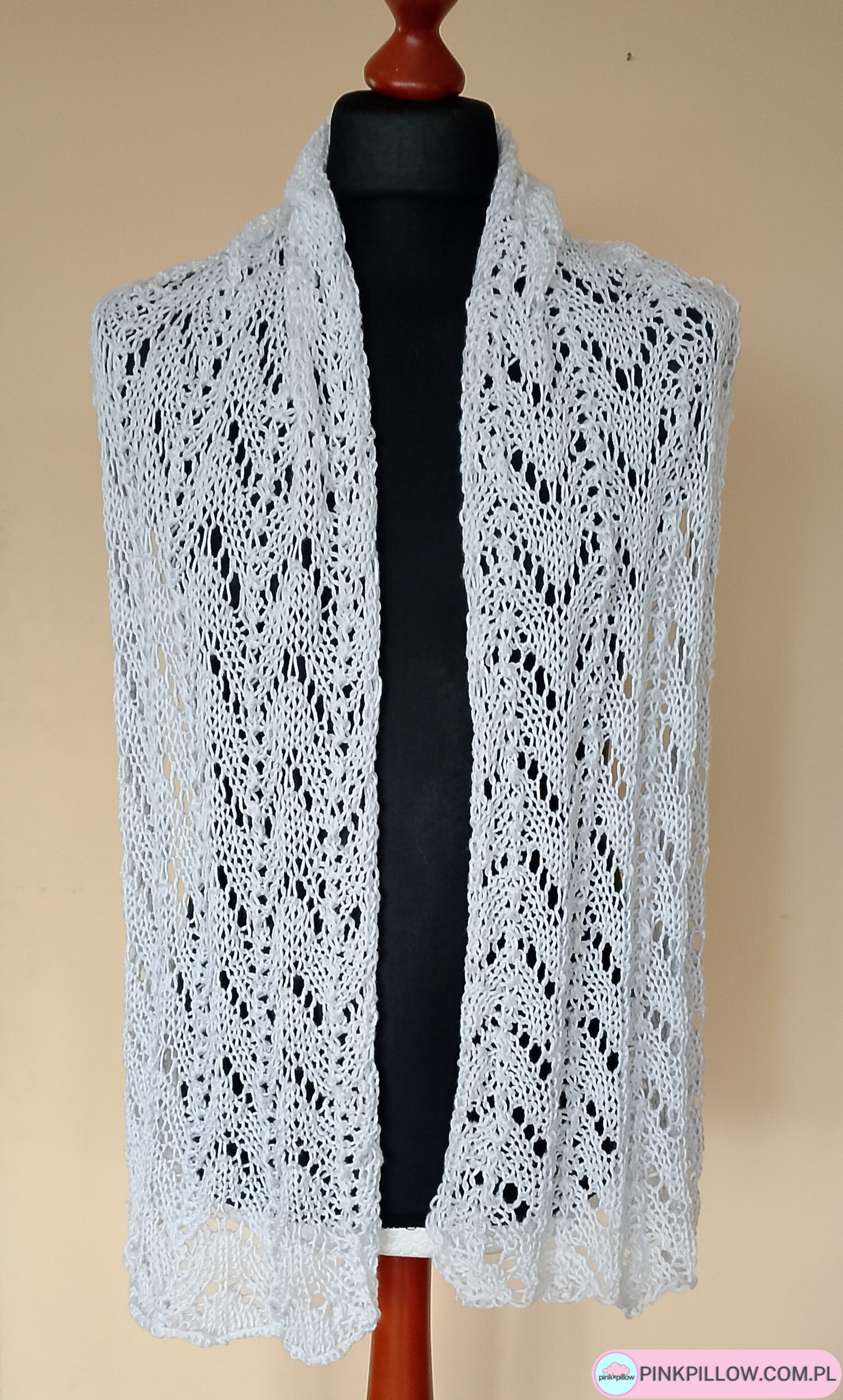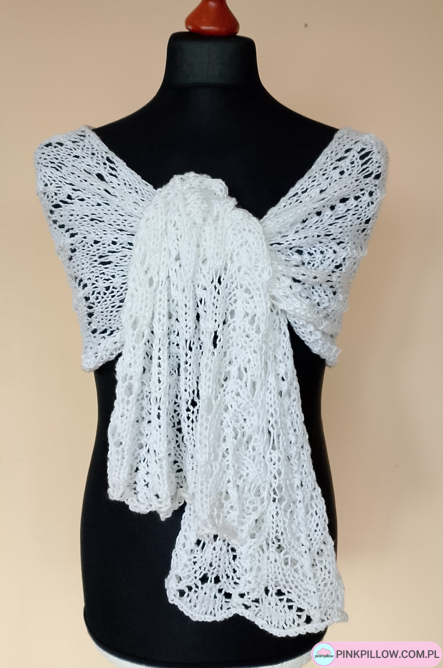 Biały elegancki szal w całości wykonany ręcznie na drutach pięknym wzorem. Szal jest niezwyklej jakości, delikatny w dotyku, o perłowym połysku, przelewający się przez palce i jedwabiście gładki.