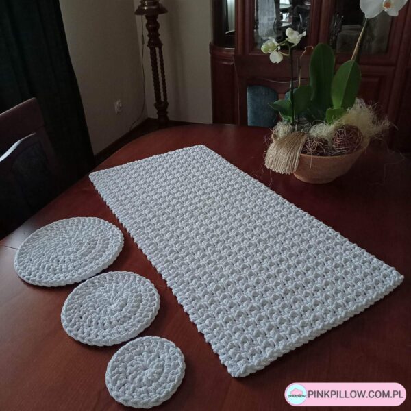 Komplet Bieżnik o wymiarach 40 cm x 80 cm oraz Trzy Podkładki o średnicy 11 cm, 17 cm i 23 cm, wykonane ręcznie metodą szydełkowania z polskiego sznurka bawełnianego 5 mm. Świetnie sprawdzą się w każdym wnętrzu szczególnie jako dodatek do kuchni lub jadalni na stół, lub stolik. W przypadku zabrudzenia wystarczy uprać podkładki w pralce w 30 stopniach i odwirować. Suszyć należy rozłożone na płasko.