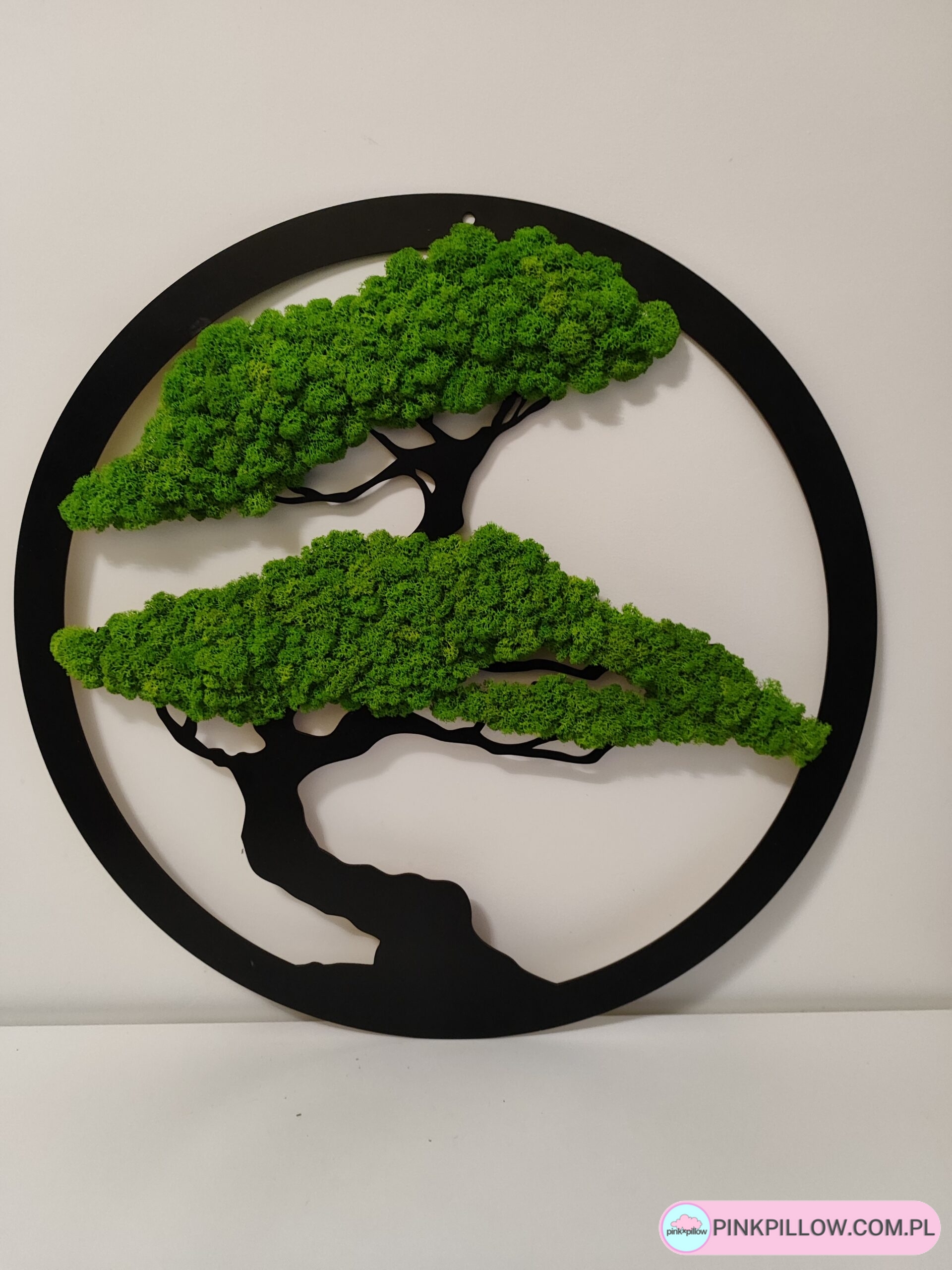 Bonsai z chrobotka na ścianę umieszczone w drewnianej okrągłej ramce ze sklejki.