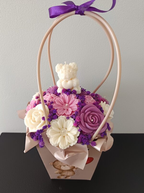 Bukiet w torebce składający się z 14 świec sojowych w kształcie kwiatów różnej wielkości z dodatkiem stabilizowanej gipsówki. Bukiet kwiatów ze świec utrzymany jest w kolorystyce biało-różowo-fioletowej. Całość umieszczona jest w kartonowym boxie w kształcie torebki i prezentuje się jak prawdziwy bukiet kwiatów. Box spakowany jest i gotowy na prezent – zawinięty jest w celofan wraz ze wstążką.