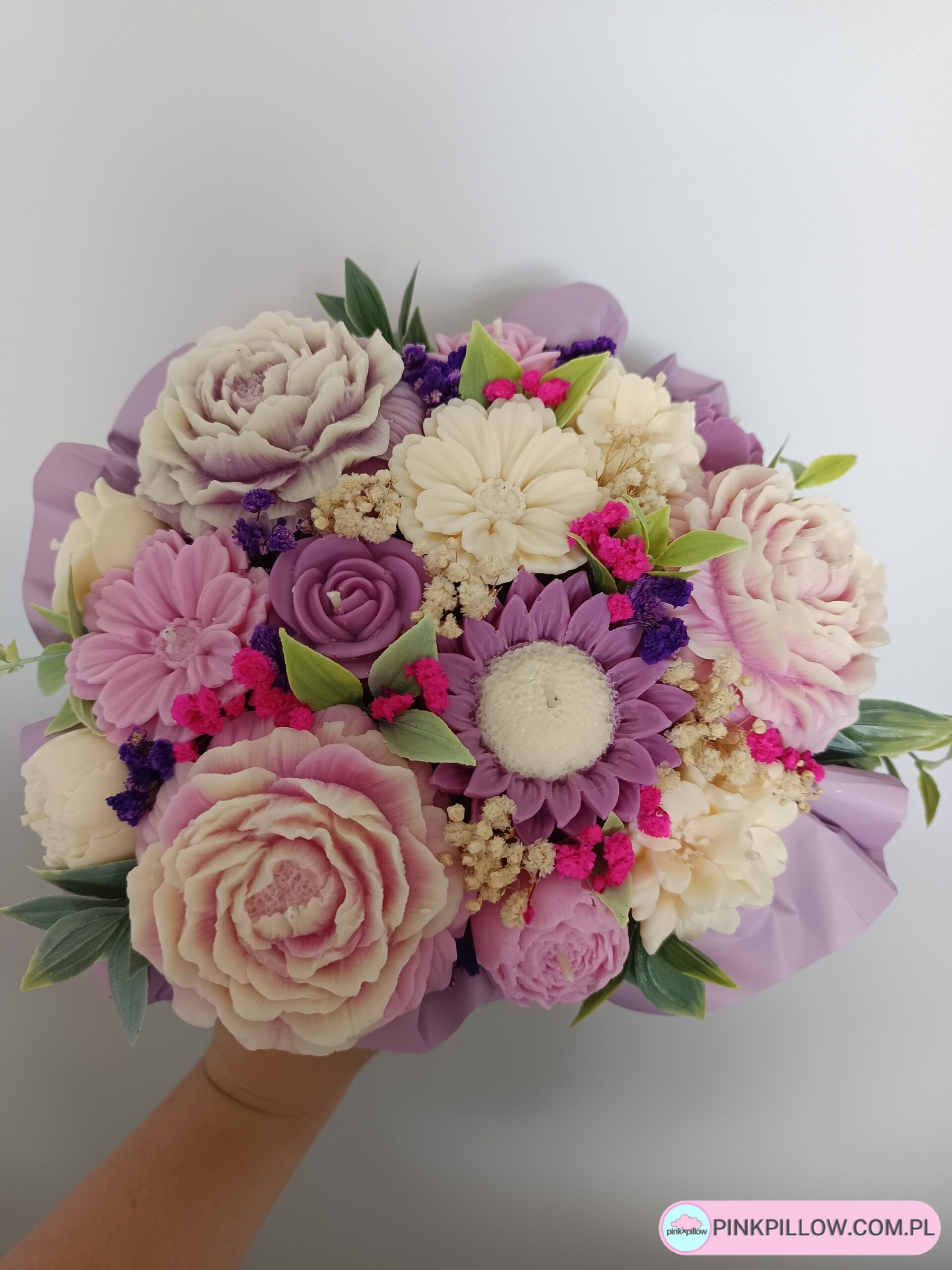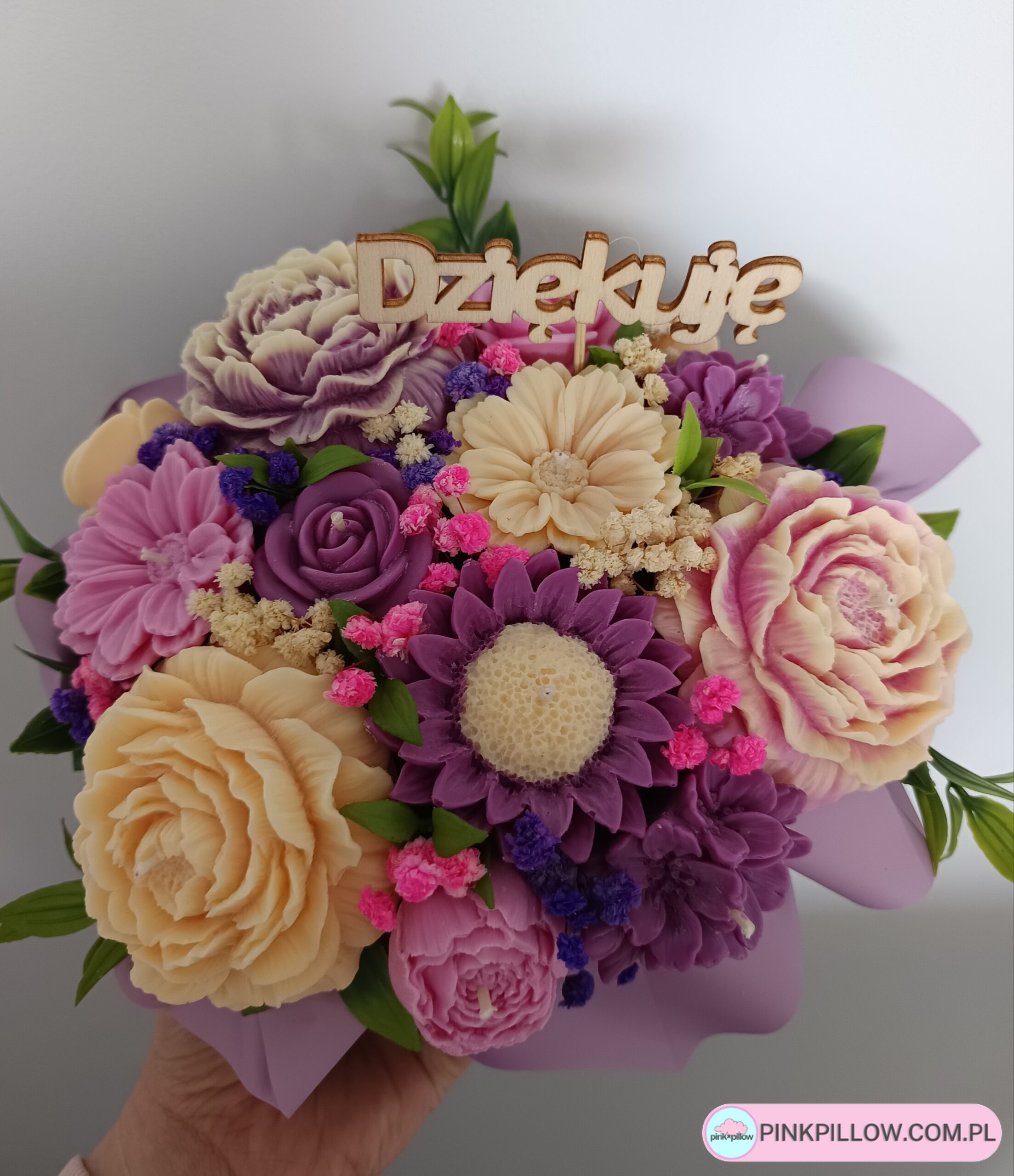 Duży Bukiet z Kwiatów i Słonecznika składający się z 14 Świec sojowych w kształcie kwiatów różnej wielkości (waga bukietu pół kilograma). Całość umieszczona jest w kartonowym boxie i prezentuje się jak prawdziwy bukiet z kwiatów. Box spakowany jest i gotowy na prezent – zawinięty jest w celofan wraz ze wstążką.