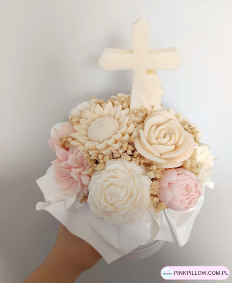 Bukiet ze świec z Krzyżem dedykowany na Pierwszą Komunię Św. Idealna alternatywa dla kwiatów czy kartek okolicznościowych. Piękny prezent, który będzie cieszył oko przez długi czas. To świetny upominek dla dziecka, ale również podziękowanie dla Chrzestnych czy Dziadków.