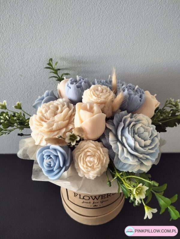 Candle Box składający się z 12 Świec sojowych w kształcie kwiatów różnej wielkości. Bukiet Kwiatów ze świec utrzymany jest w kolorystyce Błękitu i Ecru. Całość umieszczona jest w kartonowym boxie i prezentuje się jak prawdziwy bukiet kwiatów. Box spakowany jest i gotowy na prezent – zawinięty jest w celofan wraz ze wstążką.