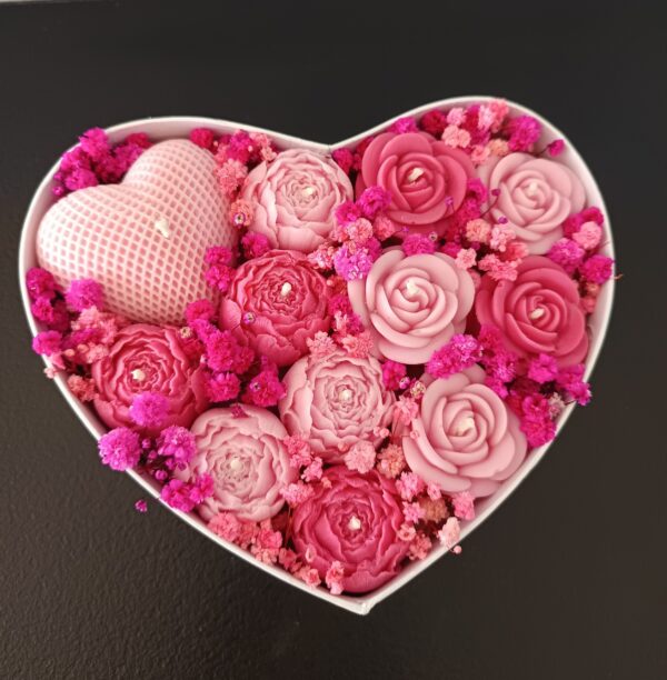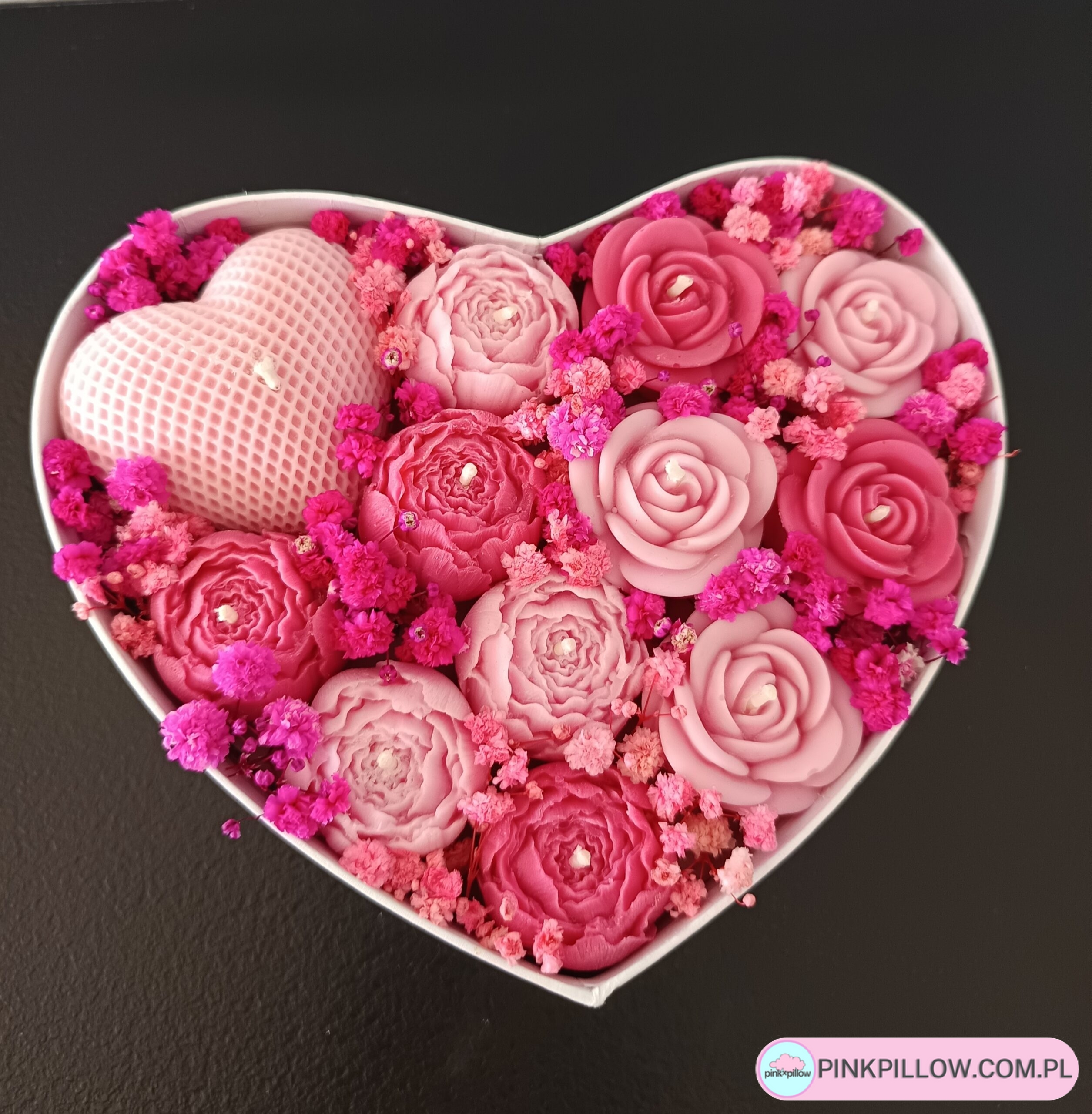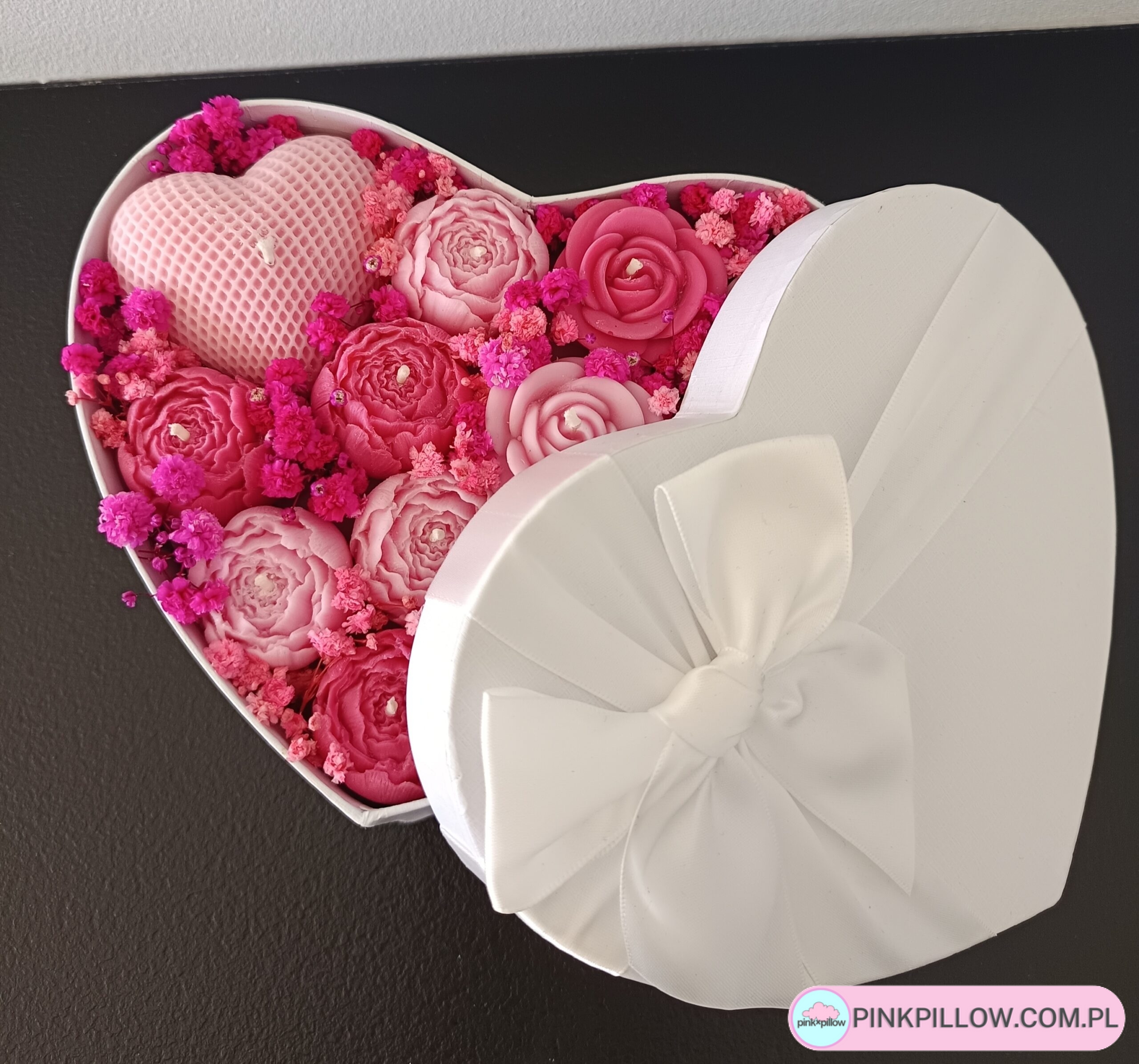 Box serce składa się z 12 świec sojowych w kształcie kwiatów różnej wielkości z dodatkiem stabilizowanej gipsówki. Bukiet kwiatów ze świec utrzymany jest w kolorystyce Biało-Różowej. Całość umieszczona jest w kartonowym boxie w kształcie serca. Box spakowany jest i gotowy na prezent Walentynkowy i nie tylko – zawinięty jest w celofan wraz ze wstążką.