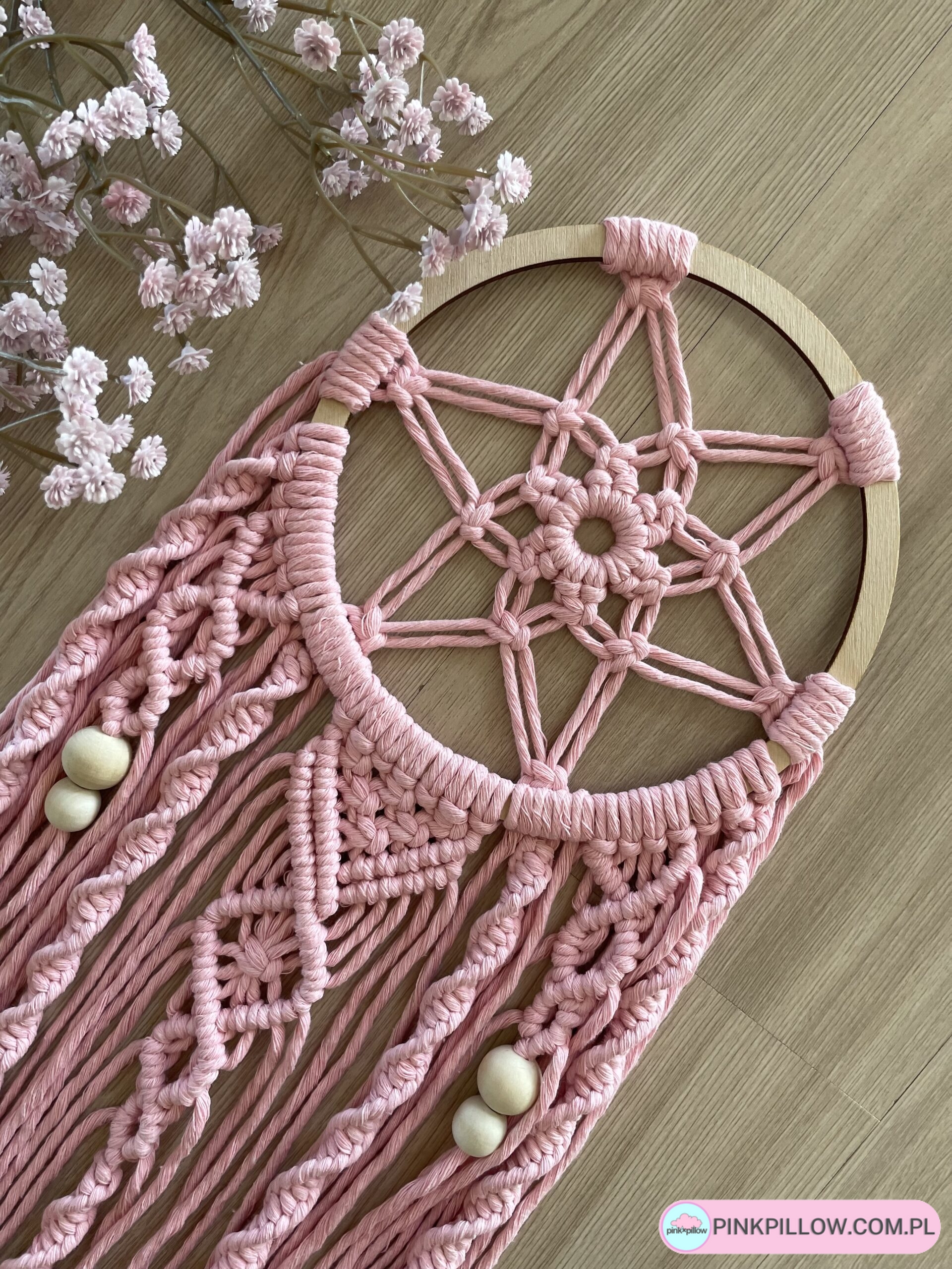 Długi łapacz snów w odcieniach pudrowego różu idealny do Pokoju Dziewczynki lub Kobiety, stworzony z pasją i dbałością o każdy detal.