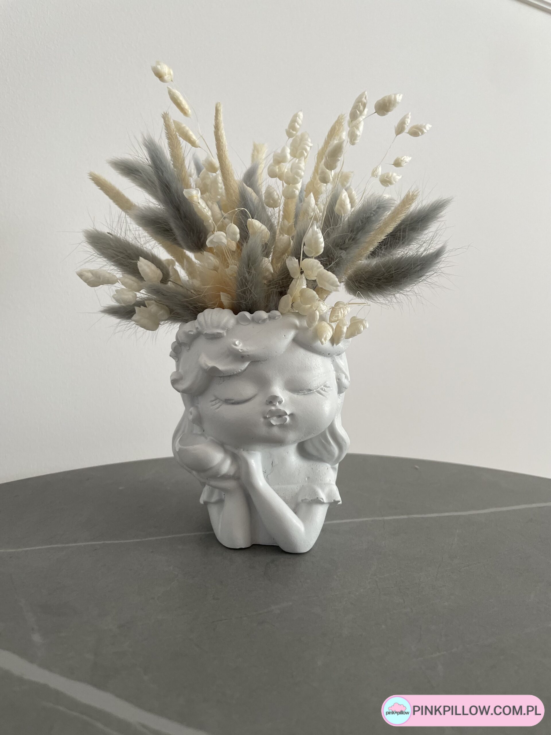 Doniczka w dziecięcym wzorze Dziewczynka, wykonana z betonu w zestawie z roślinami suszonymi i stabilizowanymi. Doniczka w kolorze Białym. Połączenie betonu i sztucznych kwiatów, tworzy niepowtarzalną dekorację.