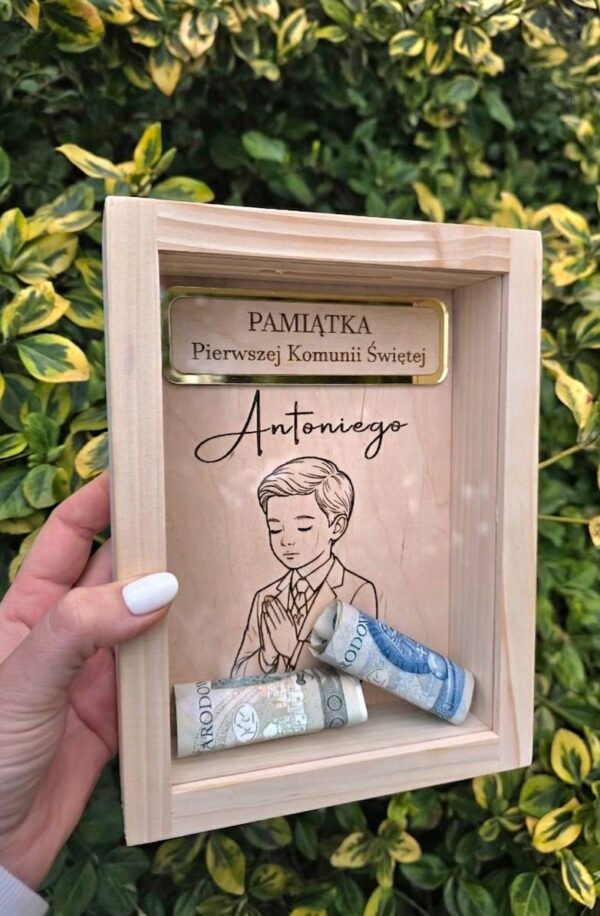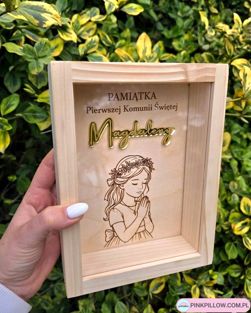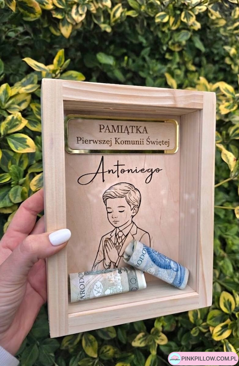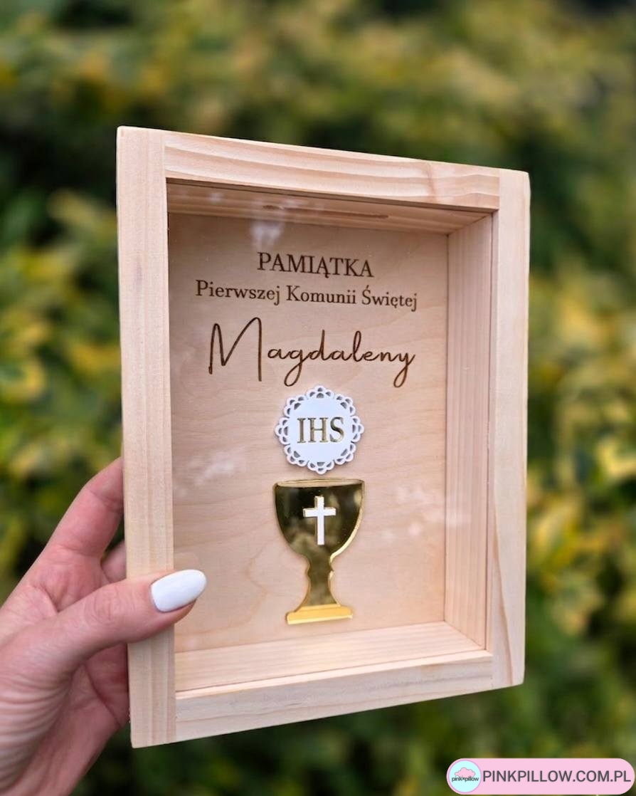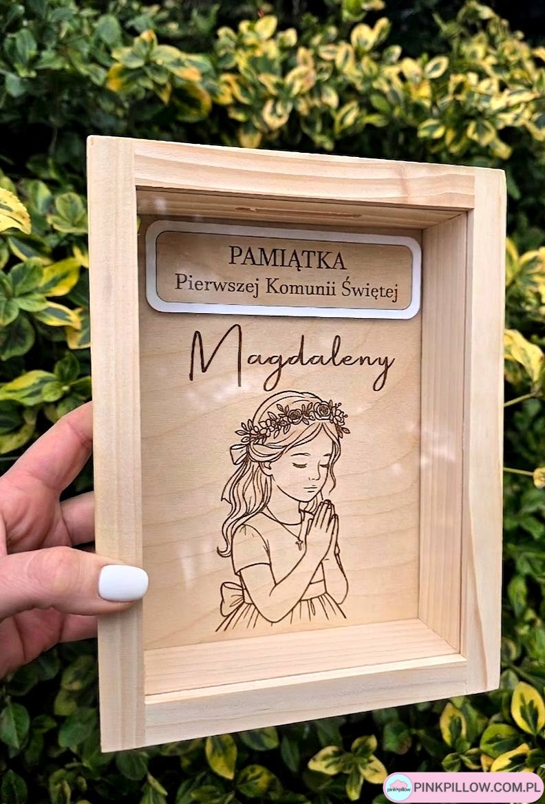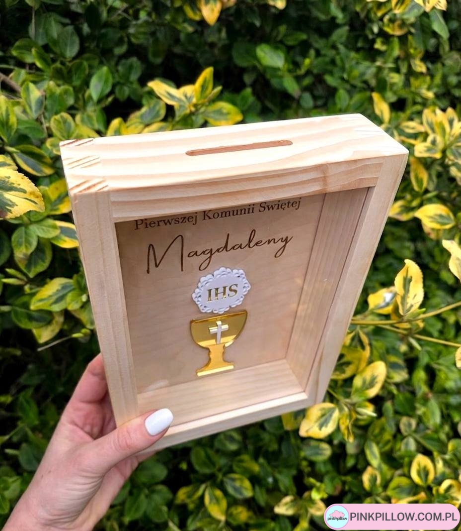 Najpiękniejsza Pamiątka Pierwszej Komunii Świętej. Wyjątkowa, personalizowana, drewniana SKARBONKA