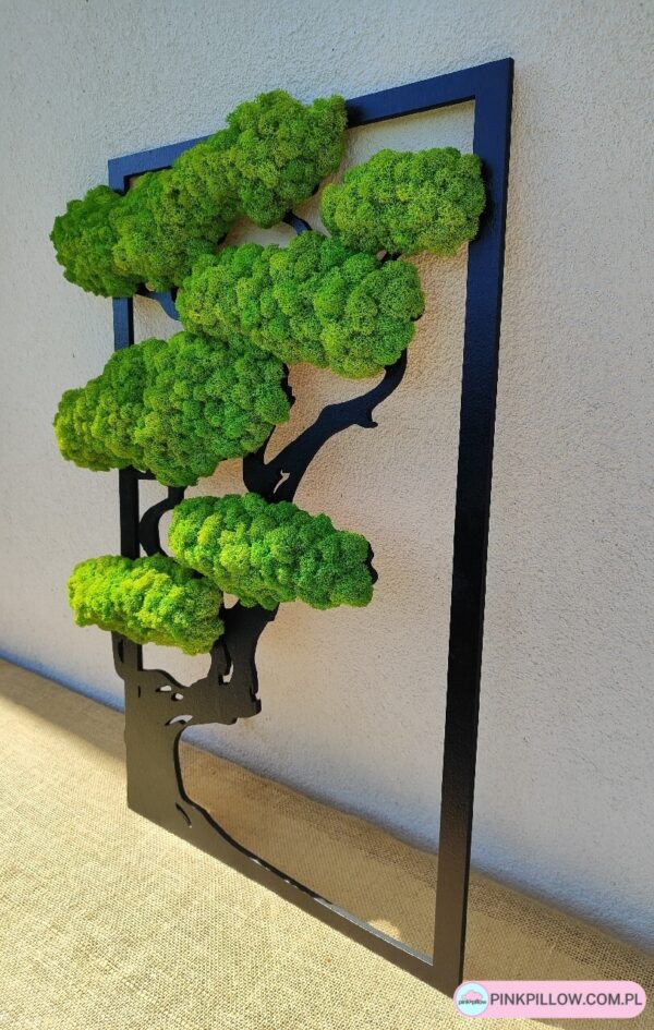 Drzewko Bonsai / Życia wykonane z Mchu Chrobotka, który nie wymaga żadnej pielęgnacji, ponieważ jest trwale zaimpregnowany. Optymalne warunki dla porostu to około 40-60% wilgotności powietrza, czyli dokładnie takie same, jakie wpływają na dobre samopoczucie człowieka. Obraz chrobotek sprawdzi się na ścianie w salonie, sypialni, przedpokoju lub łazience. Dodaj wyjątkowy i oryginalny akcent do swojego wnętrza.