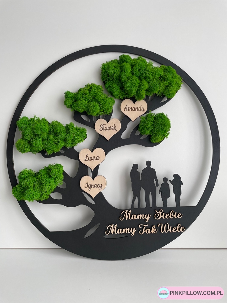 Drzewo z Imionami Rodziny z mchem Chrobotkiem o średnicy 40 cm to wyjątkowa ozdoba, która doda naturalnego charakteru każdemu wnętrzu. Wykonane z trwałej sklejki, doskonale sprawdzi się zarówno jako dekoracja do domu, jak i niezwykły prezent dla rodziny oraz bliskich.