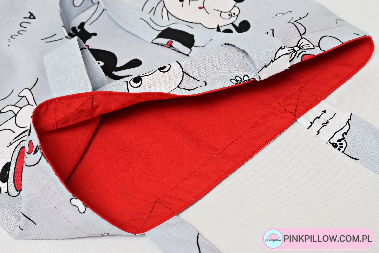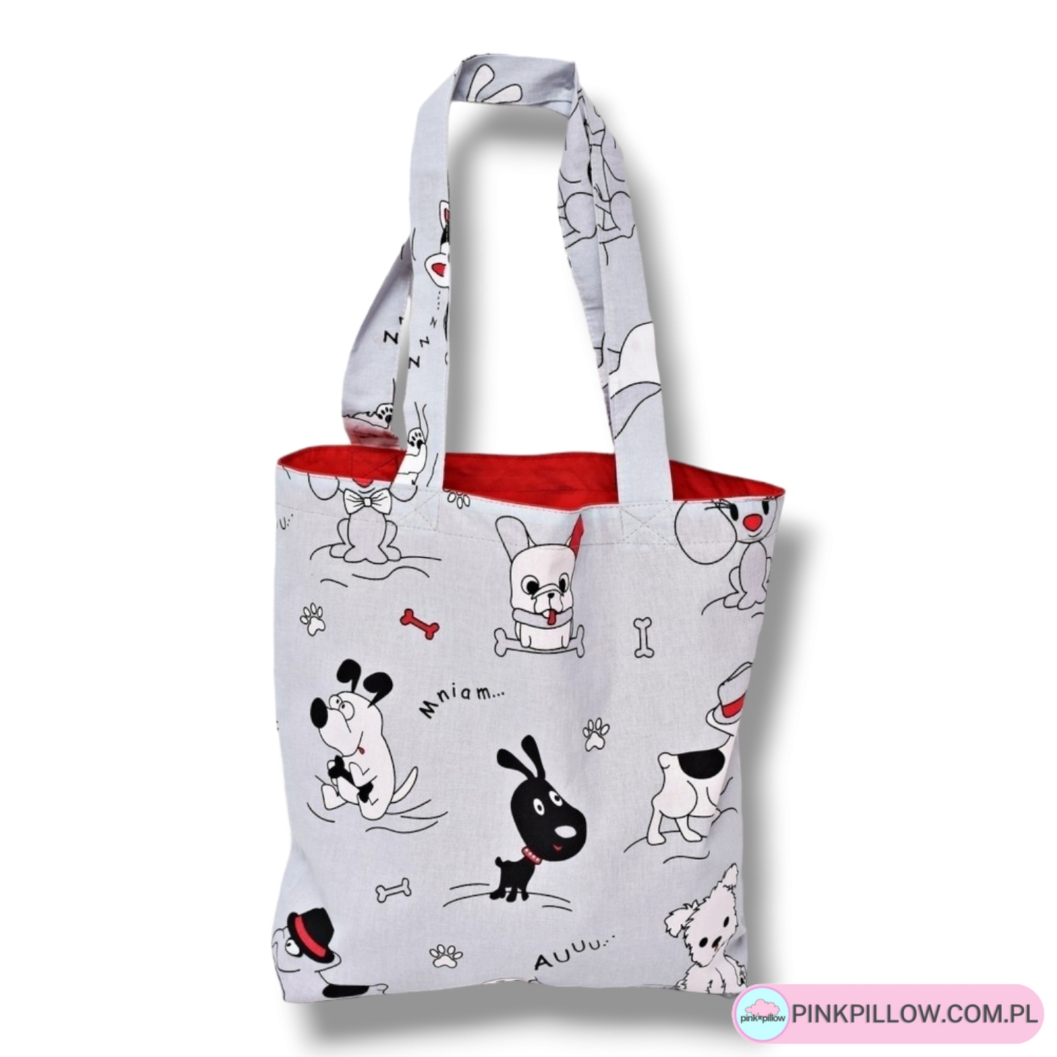 Uniwersalna materiałowa torba na ramię uszyta z bawełny 100% z motywem piesków i bawełnianą czerwoną podszewką, idealna dla dziewczynki.