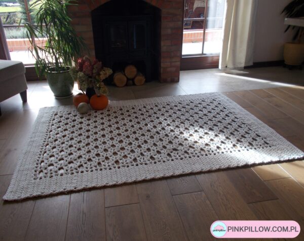 Dywan w całości wykonany ręcznie, w kolorze Ecru. Dywan jest dwustronny – dzięki zastosowanemu wzorowi jest identyczny z obu stron. Będzie przepiękną dekoracją do salonu. Całość wykonana ręcznie przy pomocy szydełka.