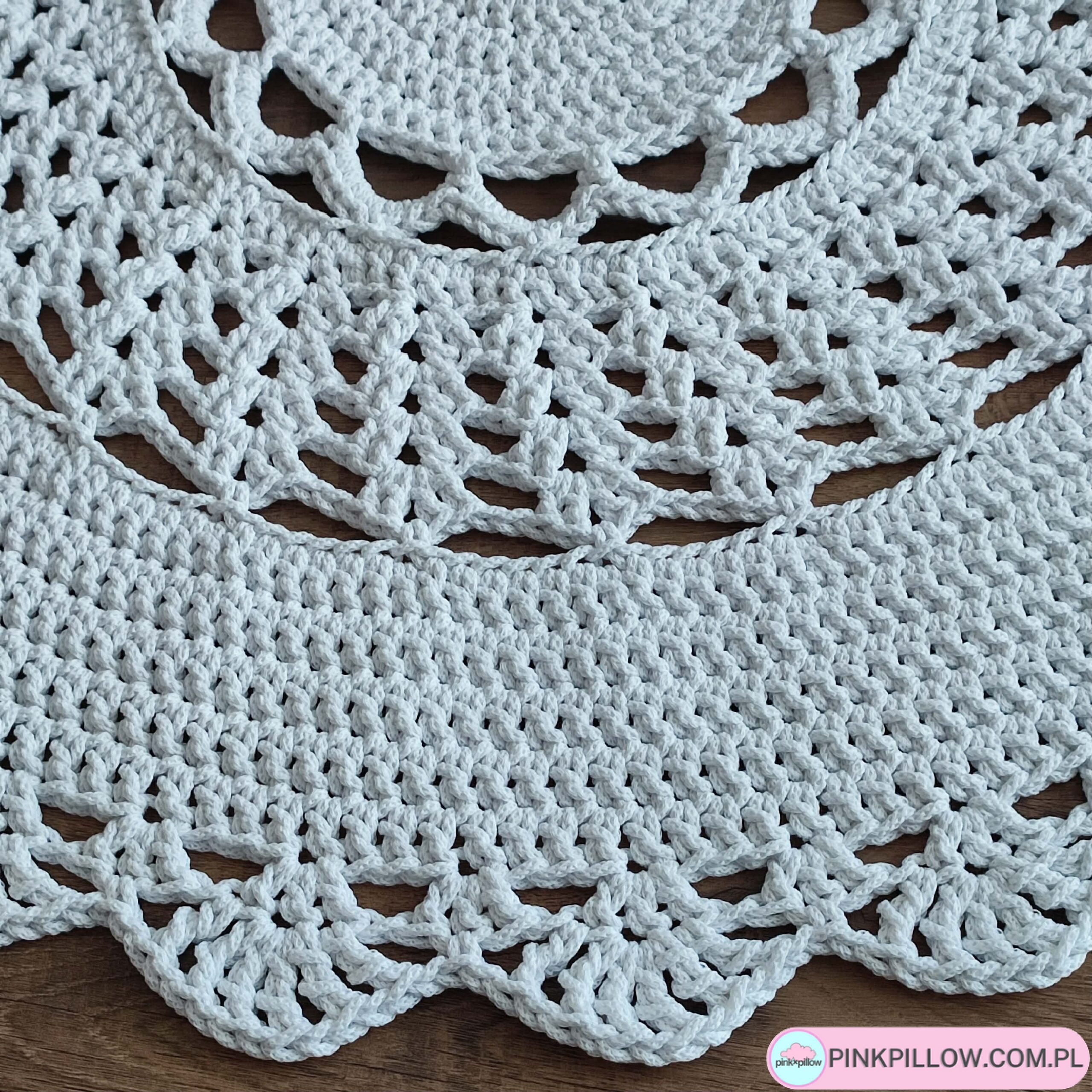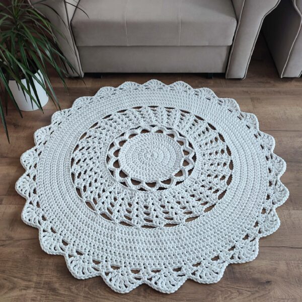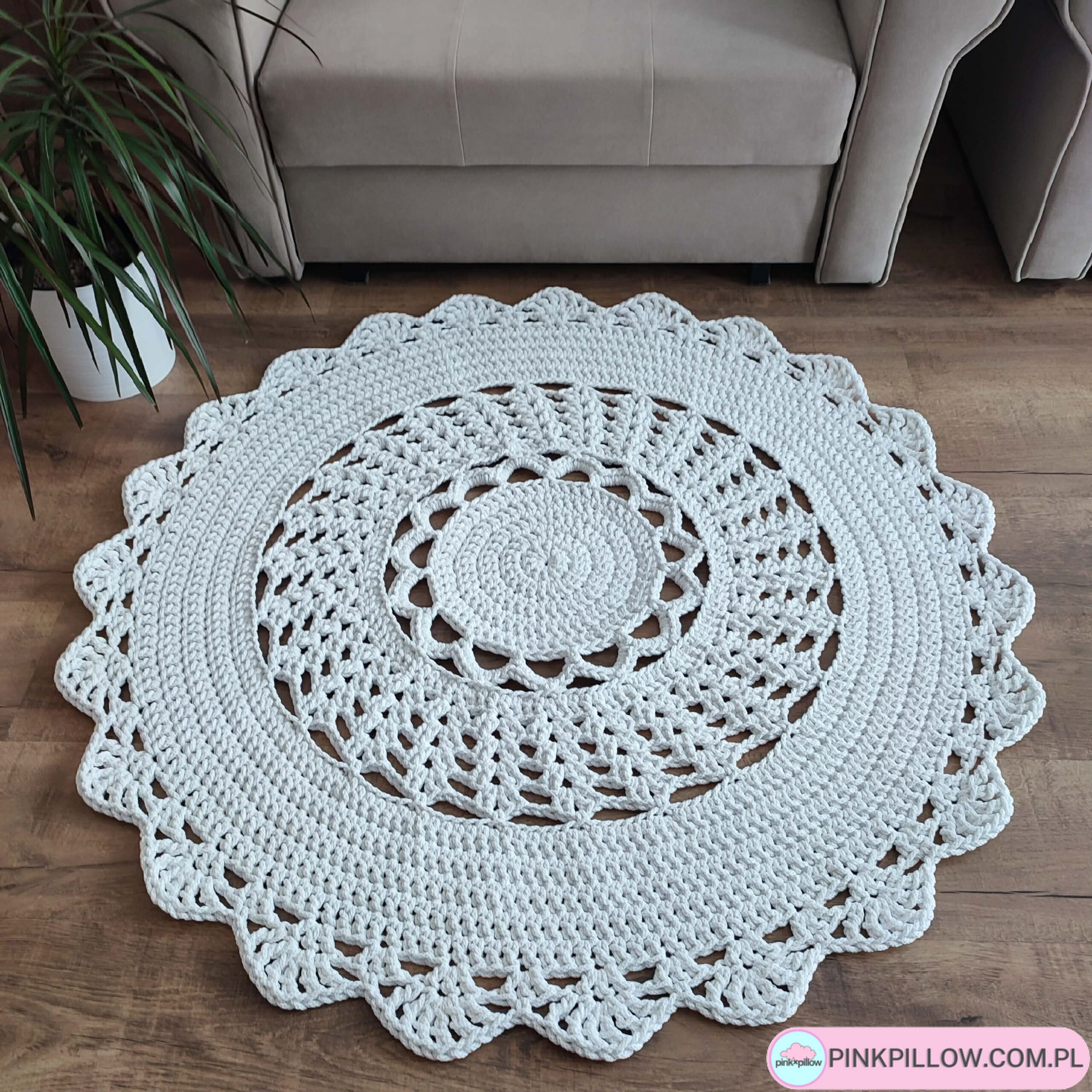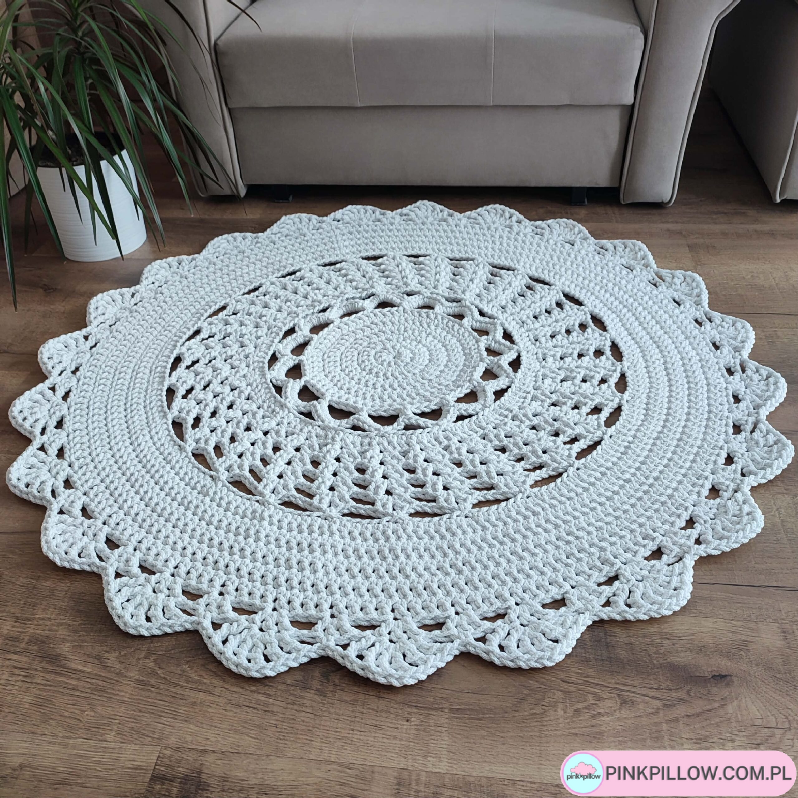 Dywan o średnicy 100 cm, wykonany metodą szydełkowania z polskiego sznurka bawełnianego 5mm. Będzie doskonałą ozdobą każdego wnętrza. Idealny do salonu, jadalni, czy innego pomieszczenia.