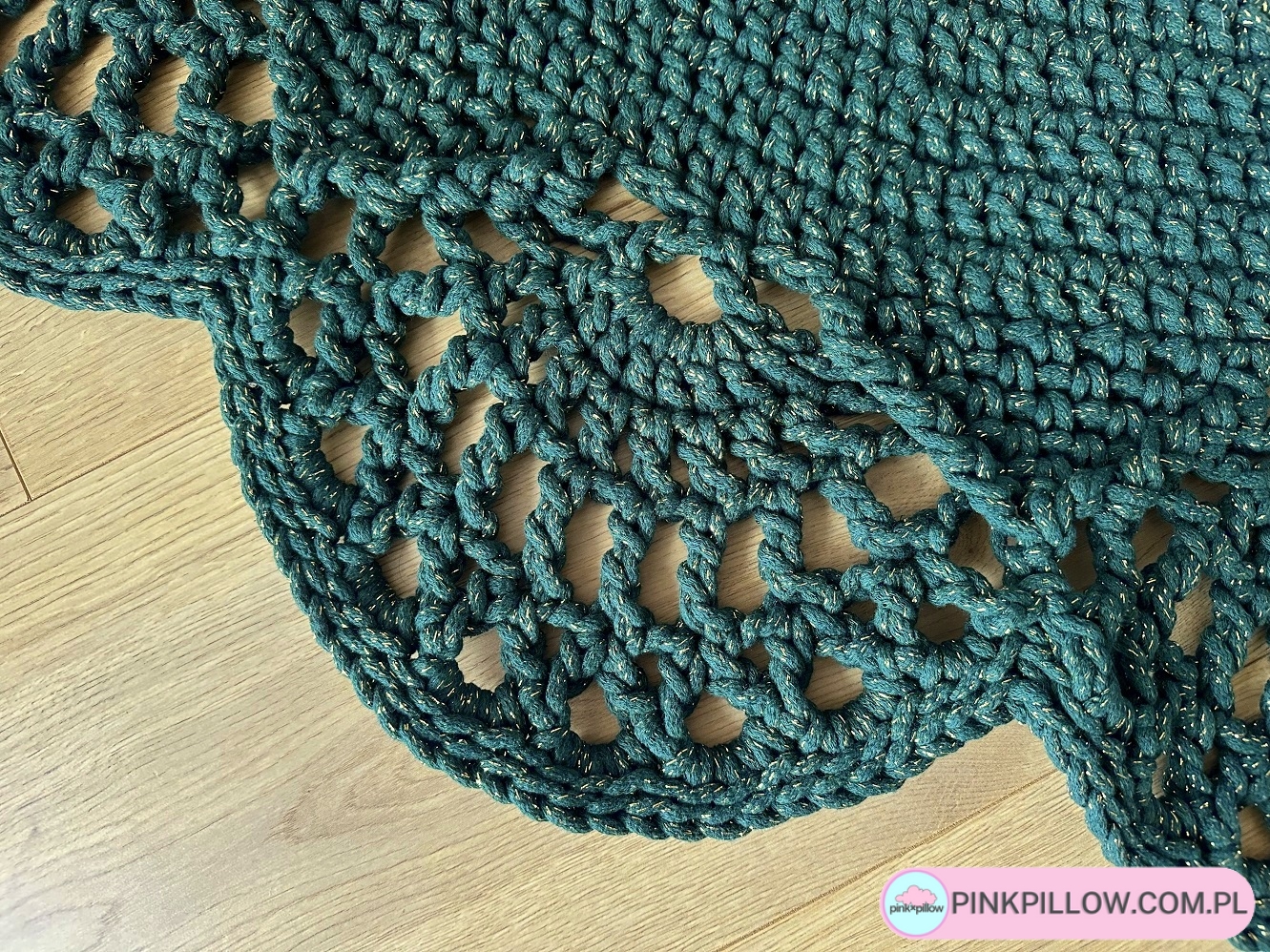Dywan w kolorze butelkowa zieleń ze złotą nitką wykonany został ręcznie na szydełku ze sznurka bawełnianego. Złota nitka pięknie mieni się w świetle. Ten duży, okazały dywan to doskonały wybór do salonu, ale sprawdzi się również w sypialni czy innym eleganckim wnętrzu.