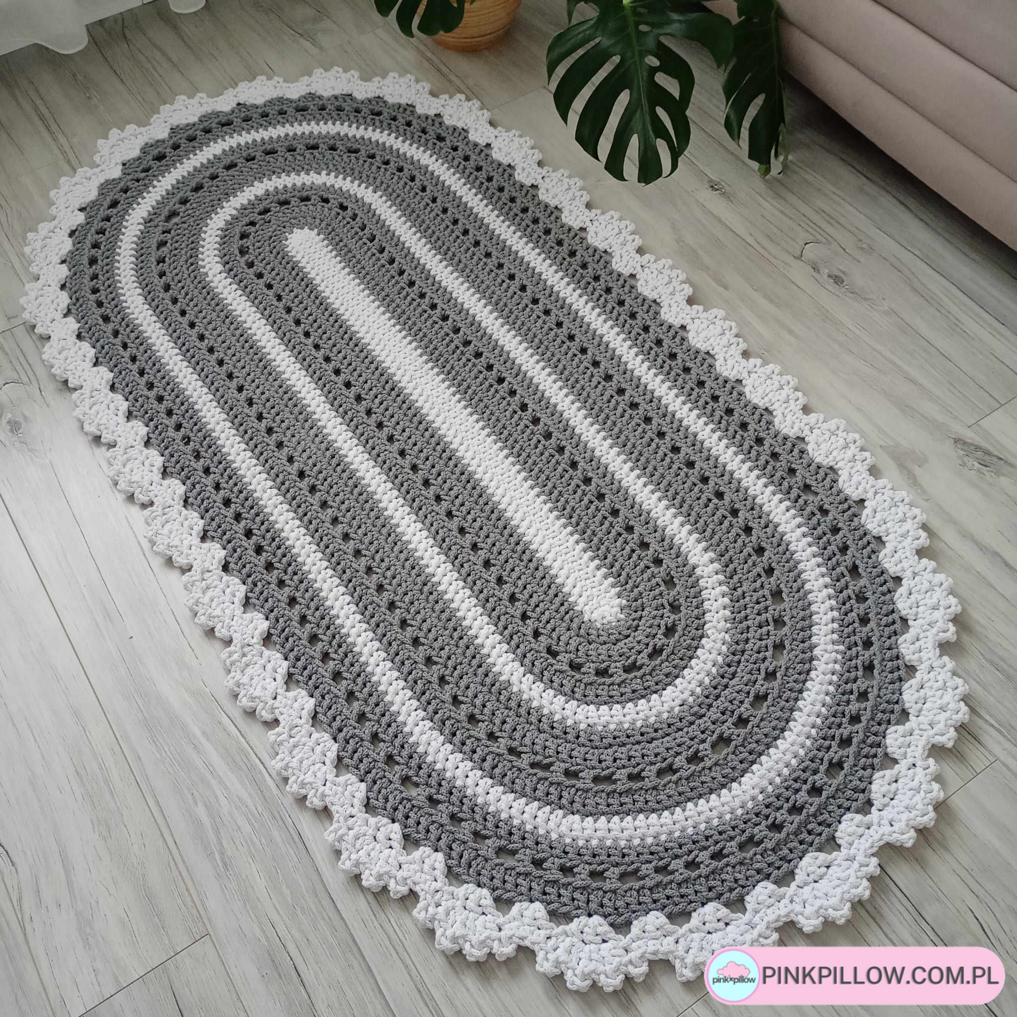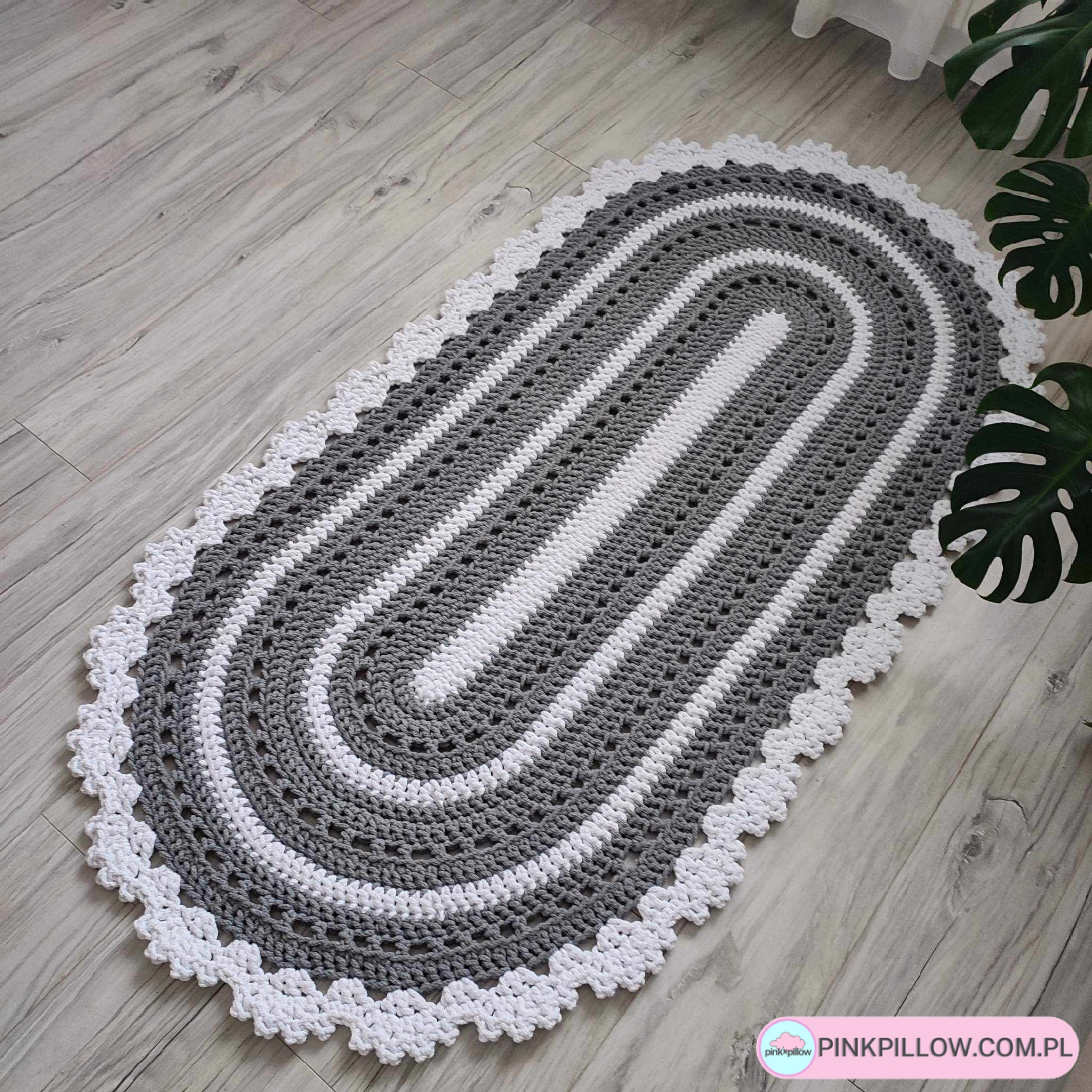 Nowoczesny owalny Dywan ażurowany o wymiarach 90 x 170 cm, wykonany metodą na szydełku ręcznie z polskiego sznurka bawełnianego 5mm. Będzie pięknym i praktycznym dodatkiem do każdego wnętrza, będąc jego ozdobą. Idealny zarówno do salonu, jadalni, sypialni, kuchni, łazienki czy na korytarz. Dywan jest łatwy w utrzymaniu w czystości – można prać go w pralce w 30 stopniach i wirować. Suszyć należy rozłożony na płasko. (Duże rozmiary należy prać chemicznie).