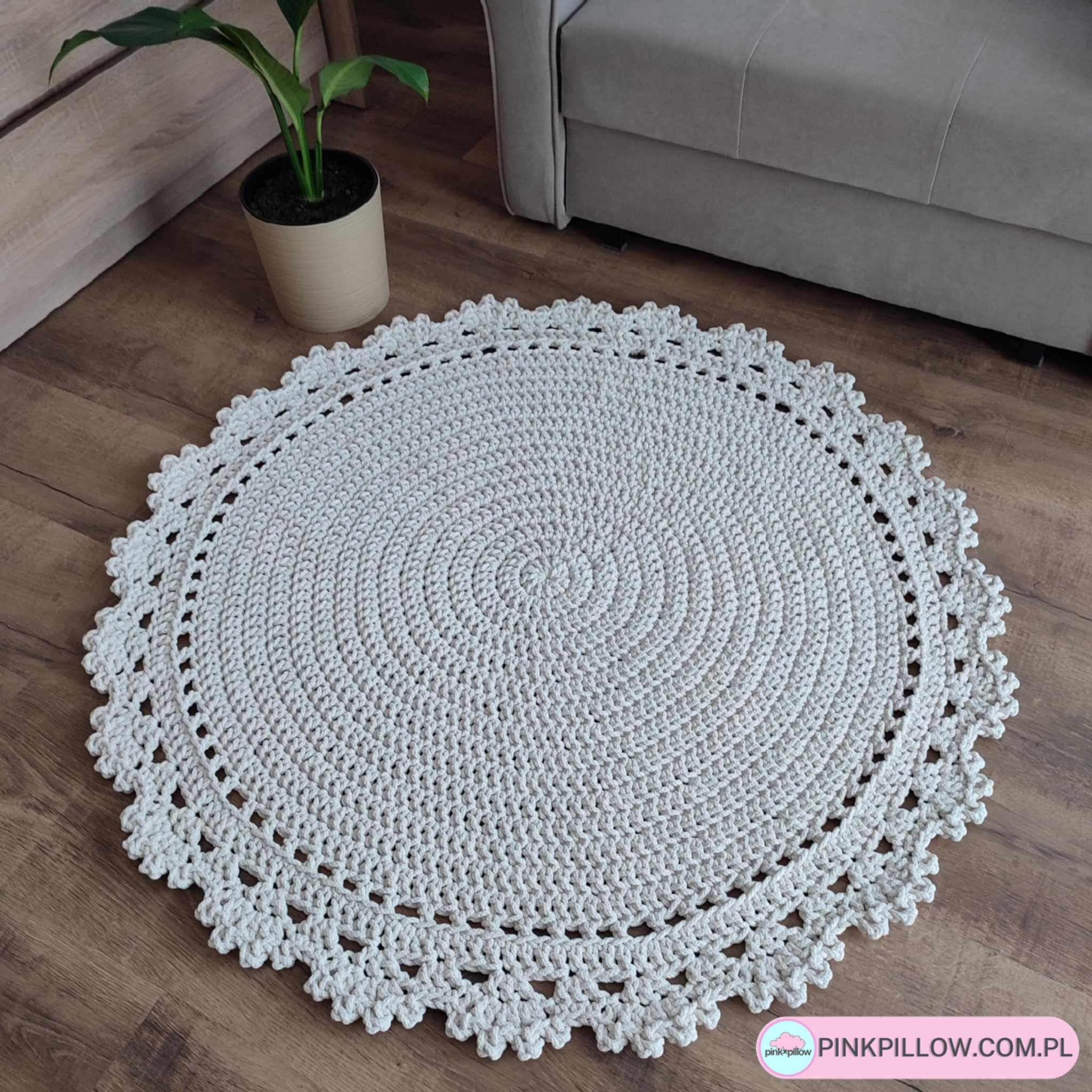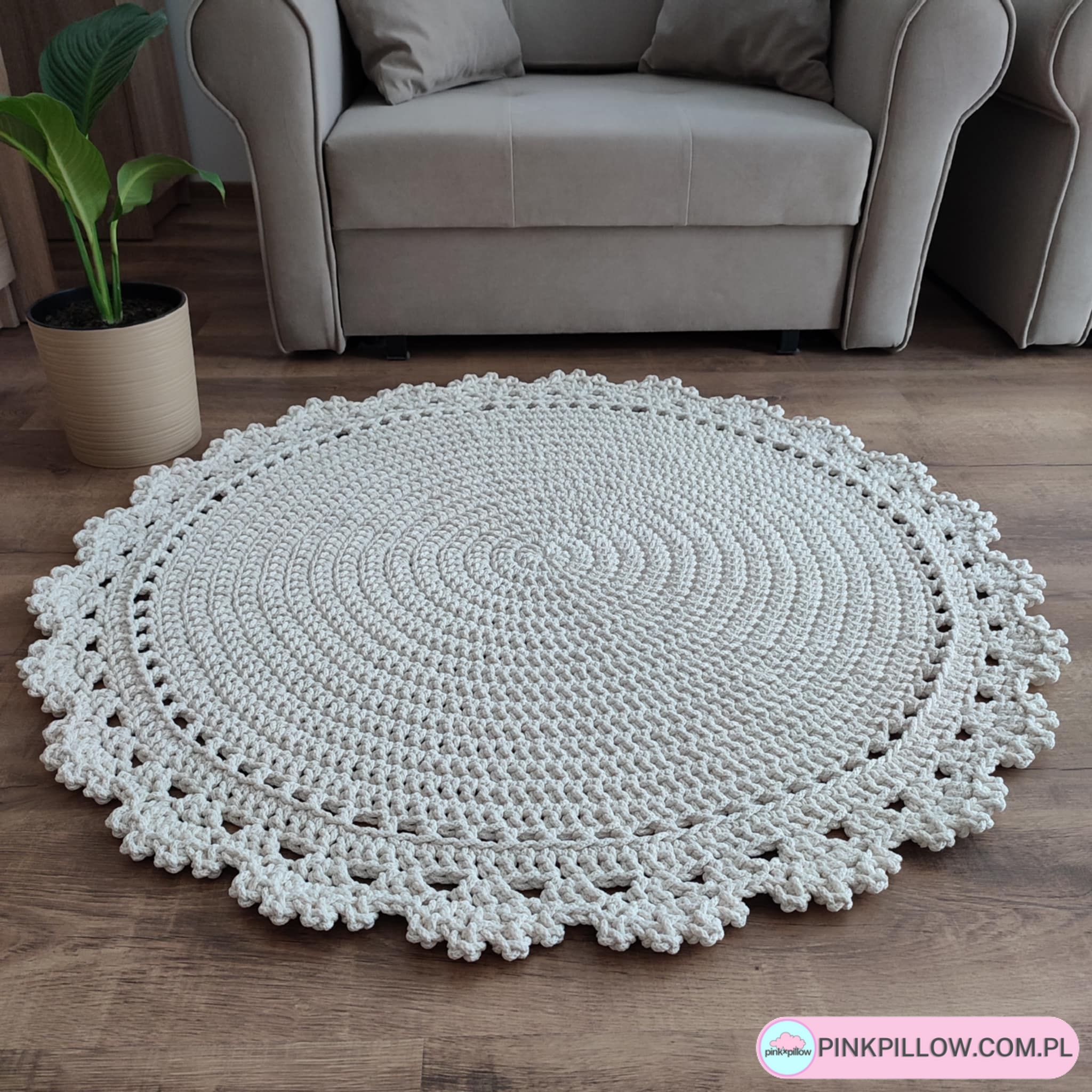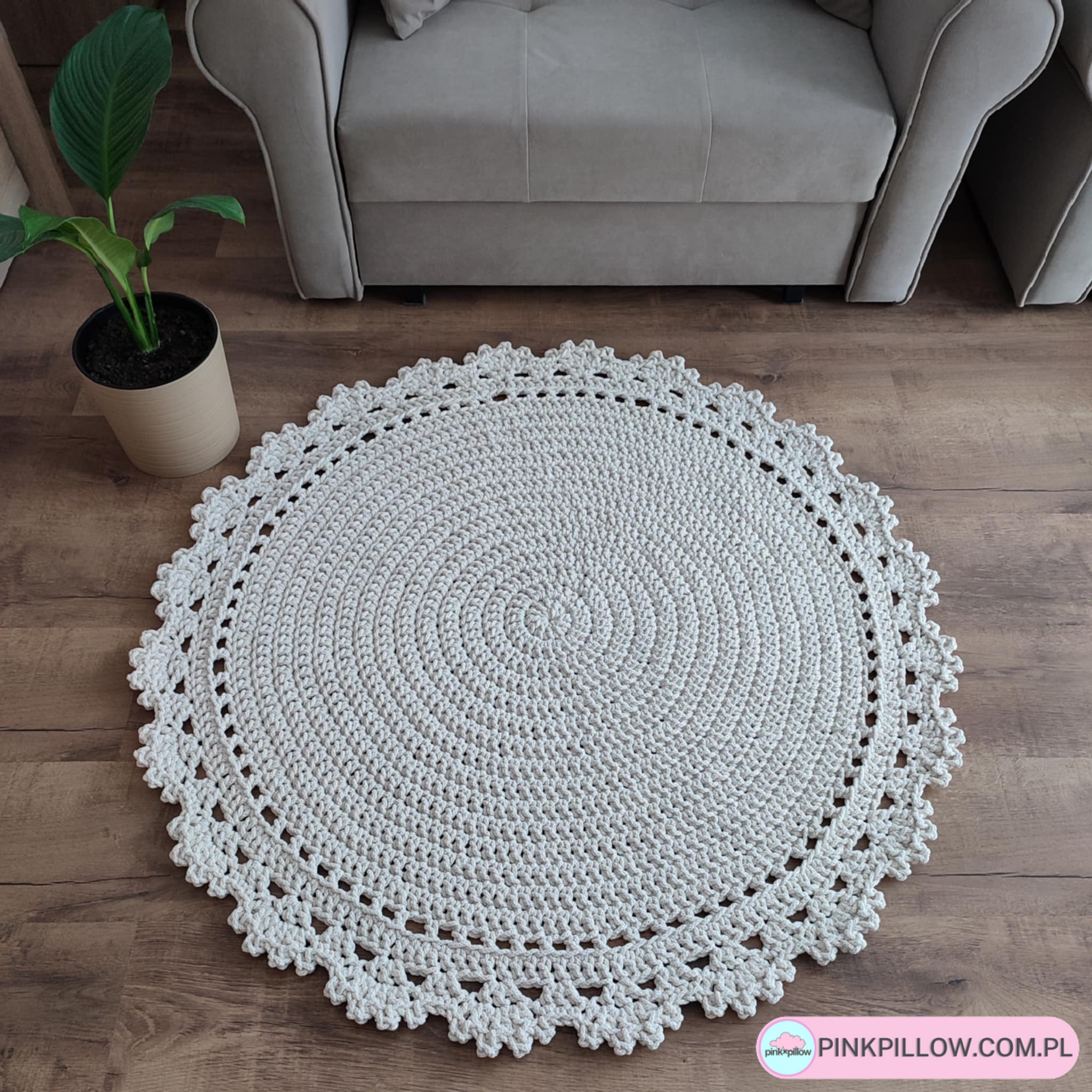 Dywan o średnicy 110 cm z dekoracyjną obramówką, wykonany metodą szydełkowania z polskiego sznurka bawełnianego 5mm. Sprawdzi się pod okrągły stół i nie tylko. Świetny do różnych wnętrz, między innymi sprawdzi się w salonie, jadalni, kuchni, łazience – doda uroku, ociepli wnętrze. W przypadku ubrudzenia, można prać w pralce w 30 stopniach i wirować. Suszyć należy rozłożony na płasko. (Duże rozmiary należy prać chemicznie).