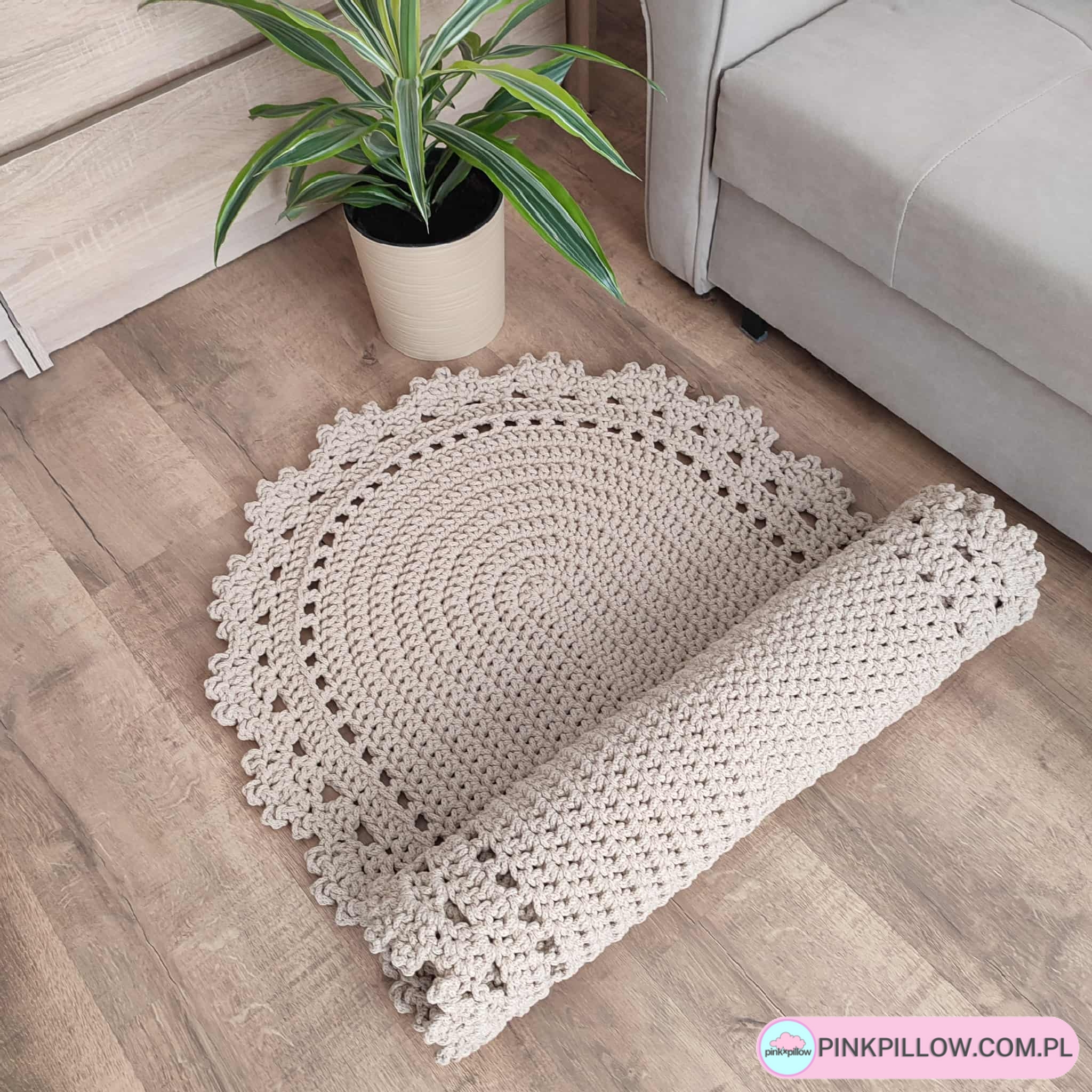 Dywan podłużny o wymiarach 75 x 160 cm, wykonany przy pomocy sznurka bawełnianego 5 mm, ręcznie na szydełku. Dywan świetny do przedpokoju, salonu, sypialni, łazienki czy do kuchni.