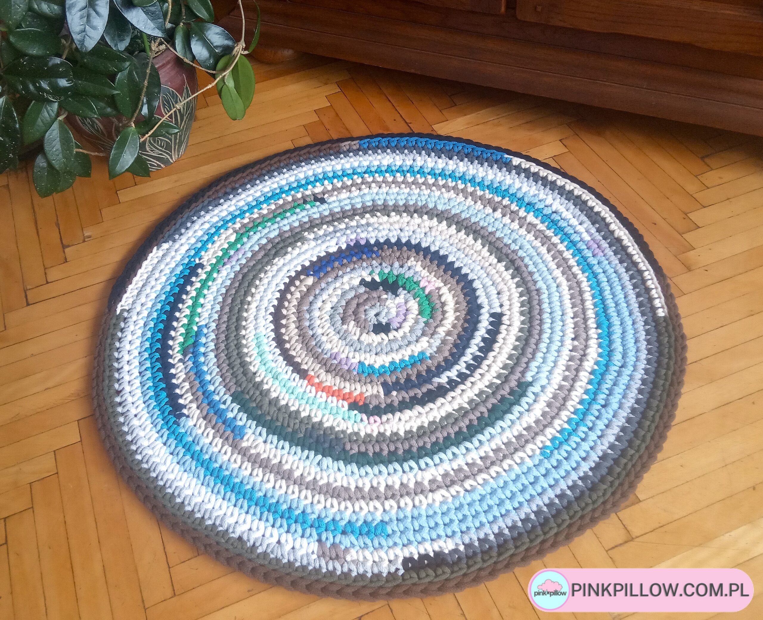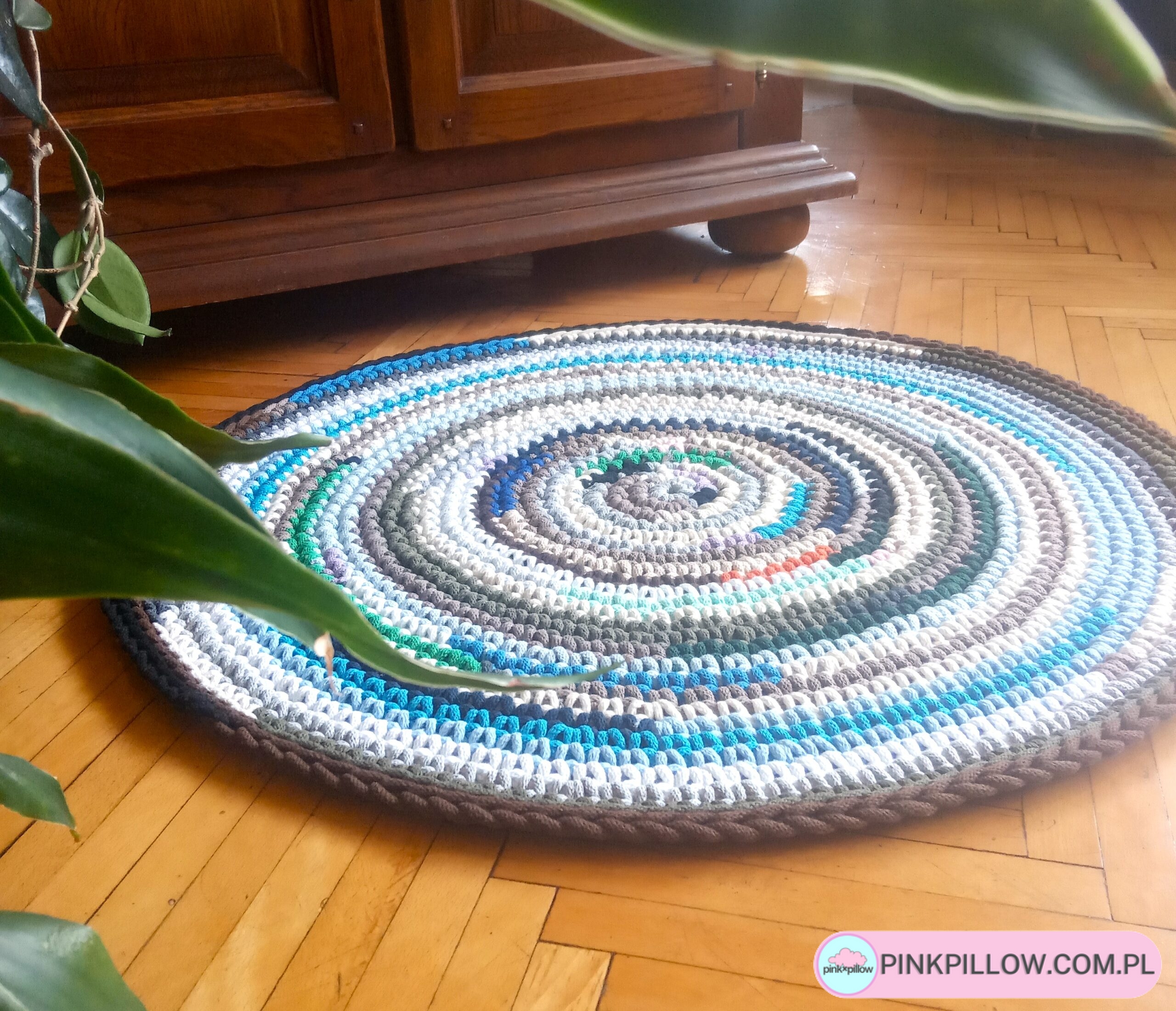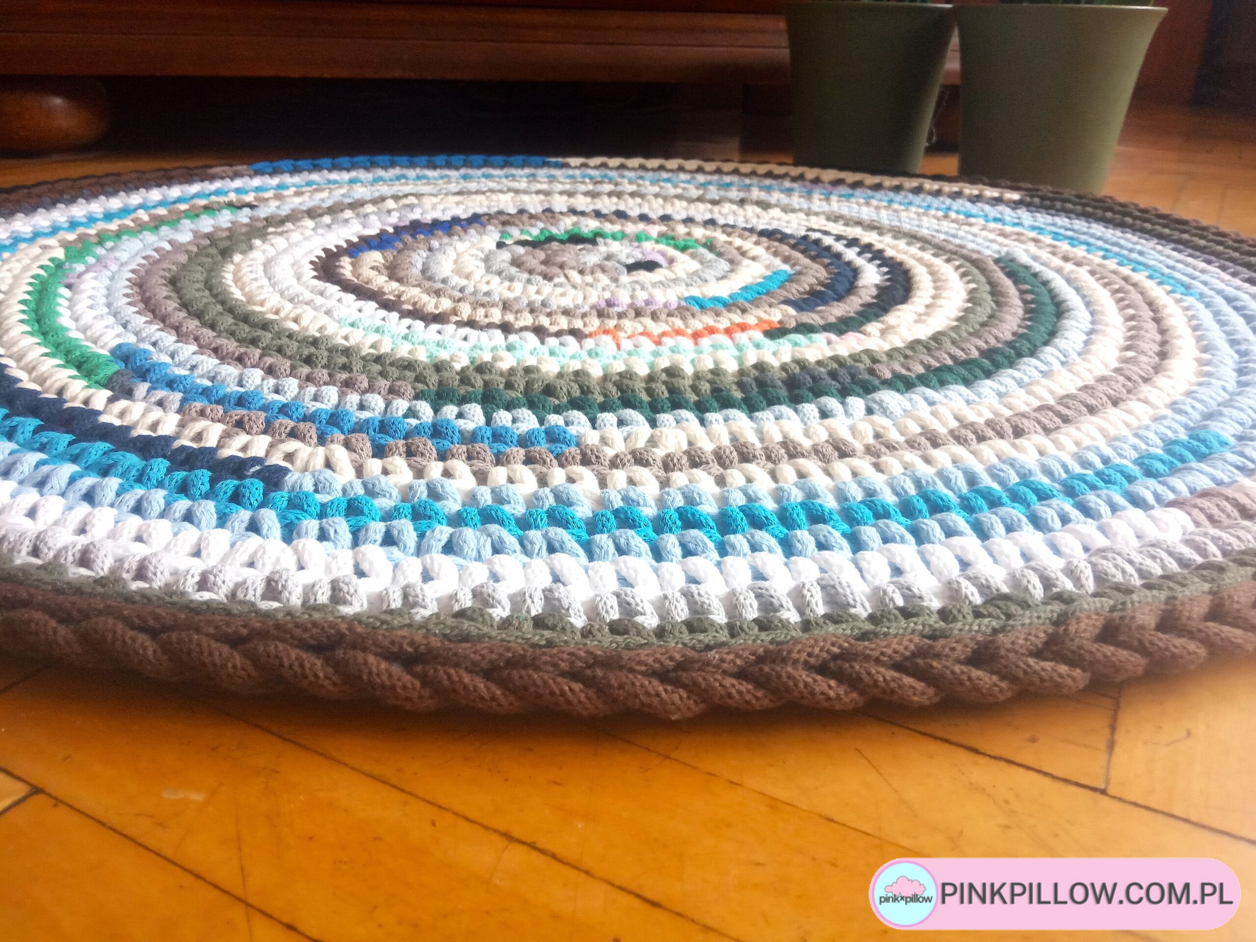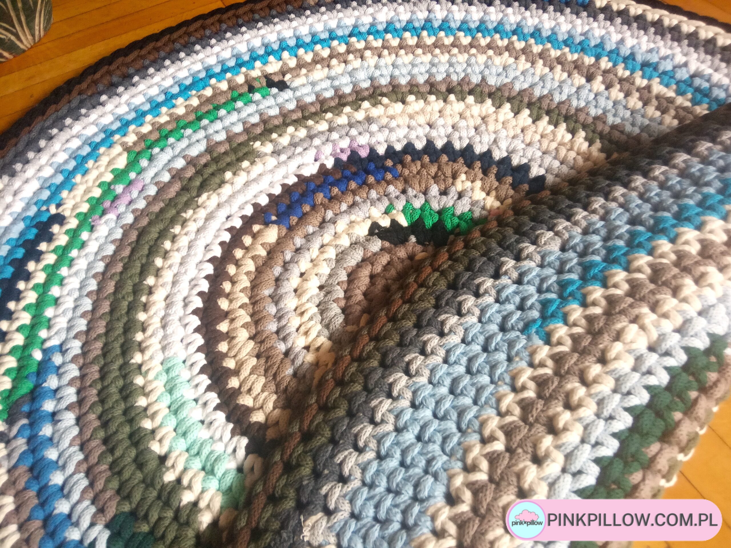 Wielokolorowy Dywan wykonany ręcznie gęstym splotem o średnicy 78 cm ze sznurków w różnych barwach. Dzięki starannemu wykonaniu dywan jest dwustronny, posiada wzmocniony brzeg, dzięki czemu nie wywija się i ładnie przylega do podłogi.