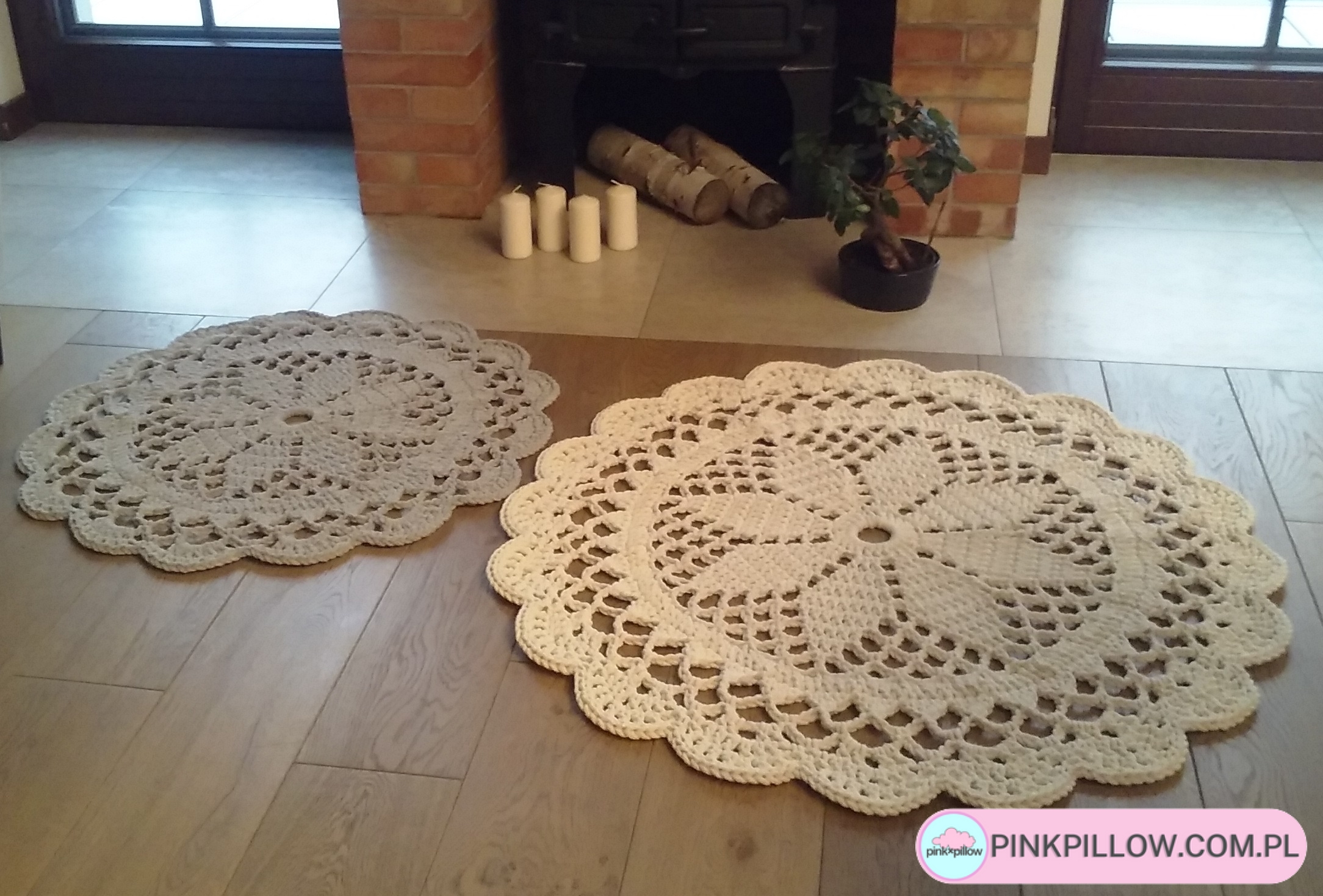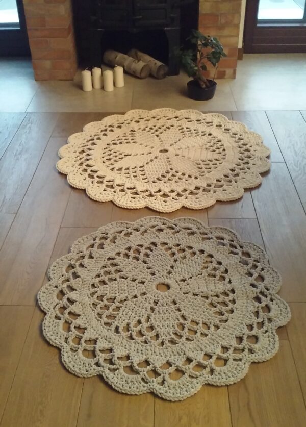 Komplet 2 okrągłych dywanów ozdobnych wykonanych ręcznie. Mniejszy dywan o średnicy 80 cm wykonany jest w Szarym kolorze, natomiast większy dywan o średnicy 110 cm ma kolor Kremowy. Dzięki starannemu wykonaniu dywany są dwustronne, ażurowe, bardzo ładnie układają się na podłodze. Ozdobią każde wnętrze. Zastosowany materiał – 5 mm sznurek w 100% bawełniany bezpieczny również dla osób z alergią. Sznurek najwyższej jakości wyłącznie od polskich producentów. Łatwe w utrzymaniu w czystości, można prać w temp. 30 st.