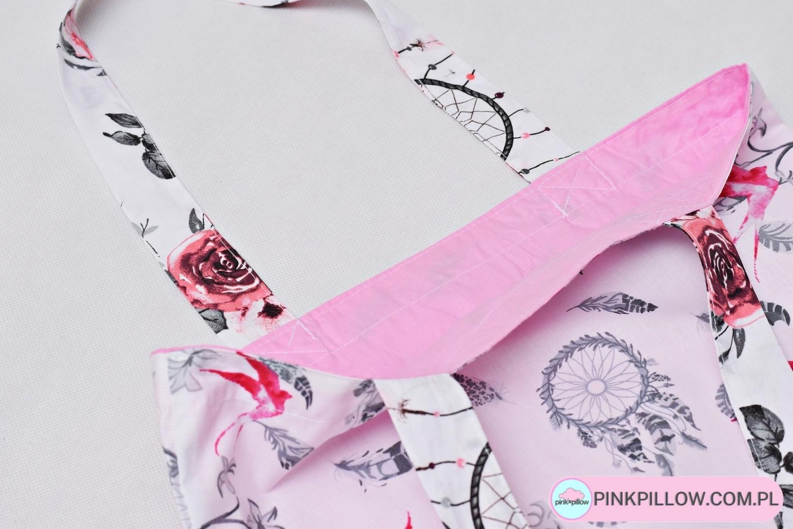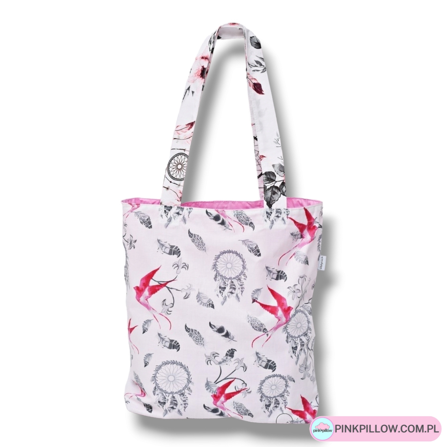 Wymień plastikowe reklamówki na jedną, porządną i wytrzymałą eko torbę z pięknym wzorem. Ekologiczna torba na zakupy uszyta z bawełny 100% z motywem Jaskółek i bawełnianą różową podszewką wewnątrz.