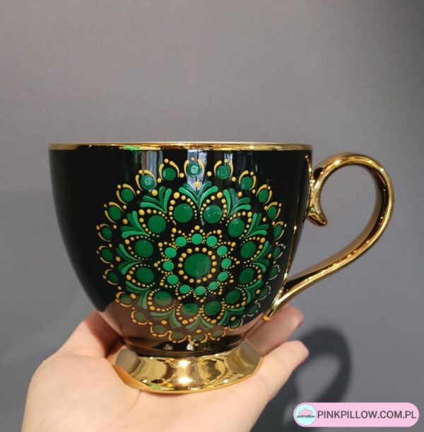 Elegancki, pojemny kubek na kawę wykonany jest z trwałej porcelany. Nanosząc ręcznie wzór metodą dot painting specjalnymi farbami przeznaczonymi do malowania szkła i porcelany zyskał dodatkowego uroku. Po naniesieniu wzoru kubek został wypalany, co spowodowało, że farba jest utrwalona i podczas mycia wzór nie zostanie naruszony.