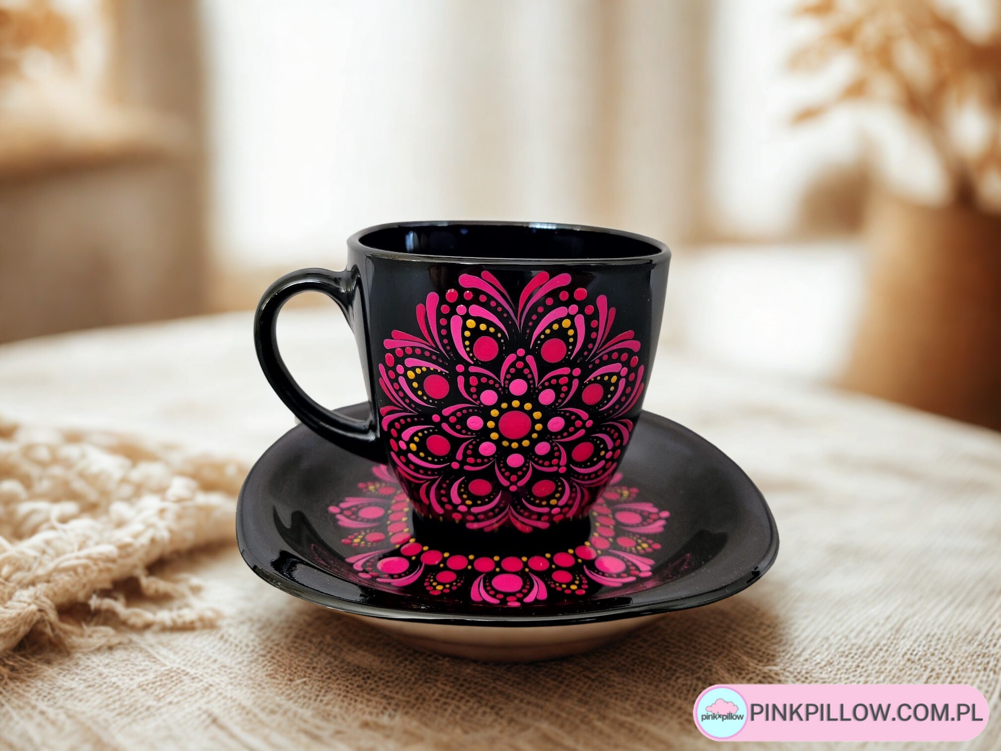 Kubek Handmade z Talerzykiem – Fuksjowa Mandala