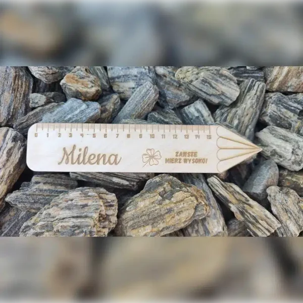 Linijka wykonana jest z trwałej sklejki o grubości 3 mm, a jej unikalny design w kształcie ołówka nadaje jej niepowtarzalny charakter. Na linijce można wygrawerować dowolne imię dziecka, co sprawia, że staje się ona nie tylko praktycznym narzędziem, ale także pamiątką o osobistym charakterze.