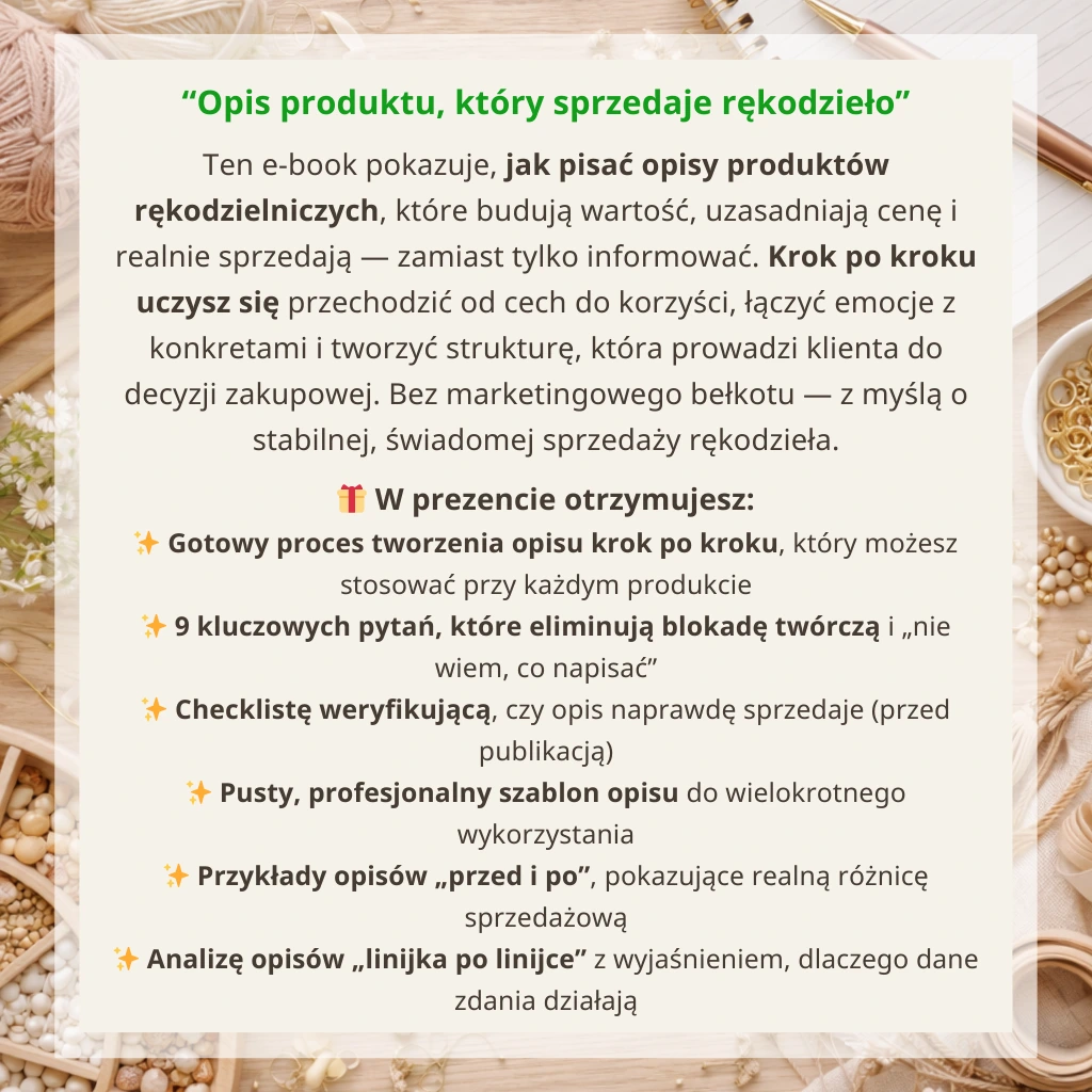 Powstał na bazie realnej pracy z rękodzielnikami i analizy setek opisów produktów, które nie sprzedawały — mimo świetnej jakości samych wyrobów.