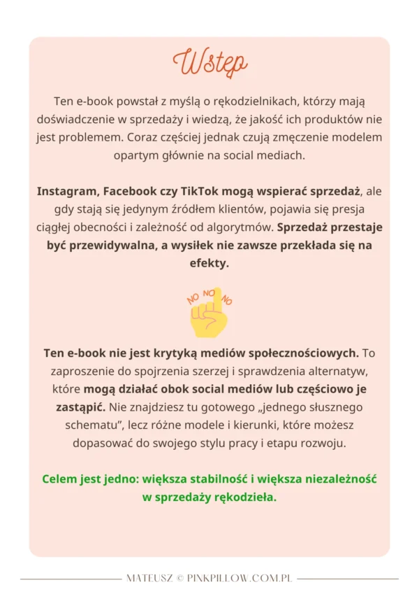 Ten e-book powstał właśnie dla rękodzielników, którzy chcą sprzedawać stabilnie, spokojniej i bardziej przewidywalnie — bez uzależnienia od social mediów.