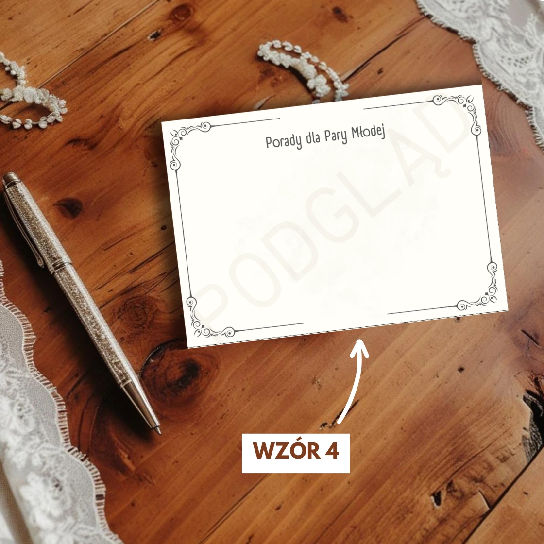 To świetna alternatywa (lub dodatek) do tradycyjnej księgi gości – bardziej swobodna i zabawna. Karteczki z poradami do druku możesz przygotować samodzielnie – wystarczy pobrać plik PDF, wydrukować w domu lub w drukarni i rozłożyć na stoliku dla gości.