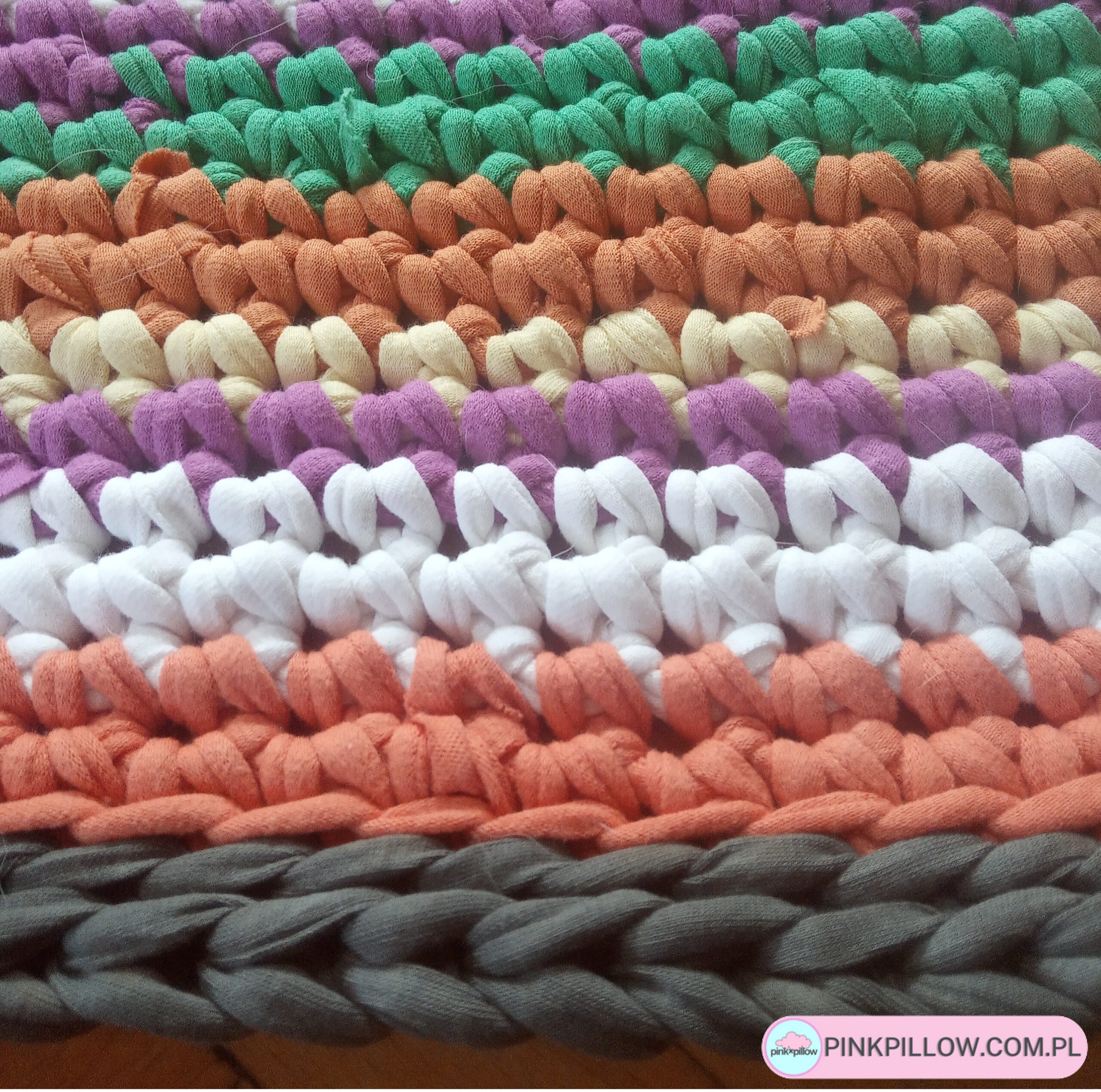 Kolorowa Mata Zero Waste, wykonana ręcznie z pociętych w paski T-shirtów idealna pod nogi. Powstała w ramach twórczego recyklingu – jest egzemplarzem unikatowym. Będzie wyjątkową i w 100 % ekologiczną ozdobą mieszkania, nada mu kolorem energii i ożywi wnętrze.