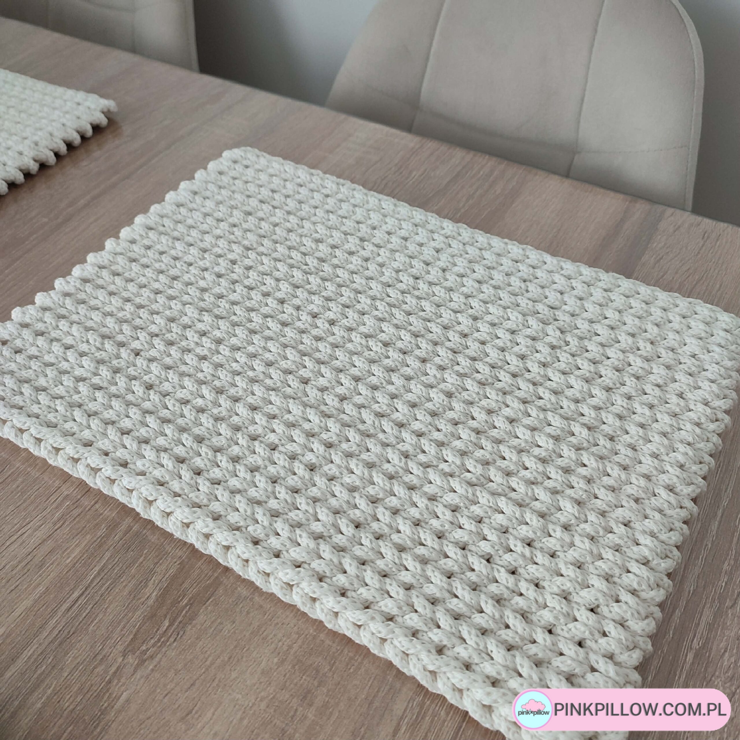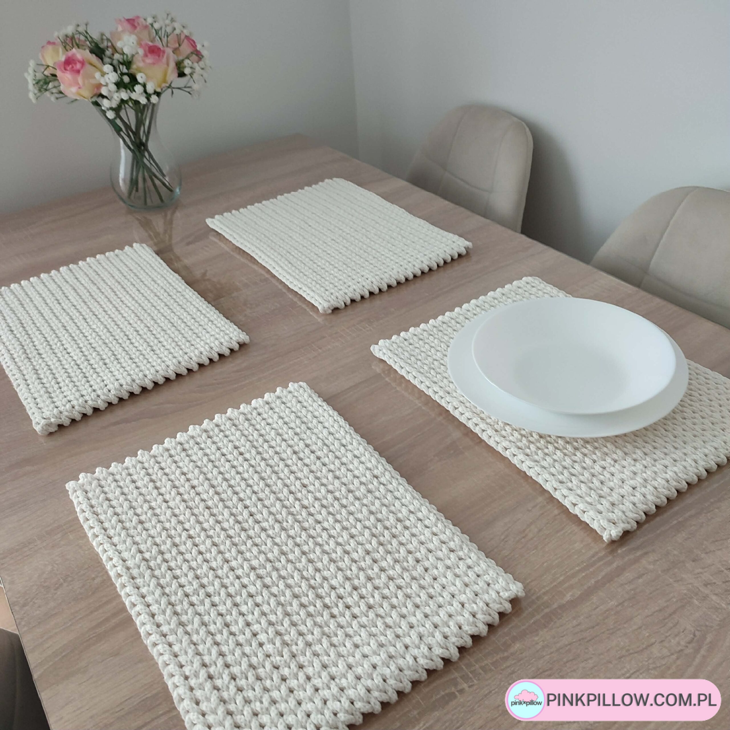 Komplet podkładek – 4 sztuki o wymiarach 25cmx35cm, wykonany metodą szydełkowania z polskiego sznurka bawełnianego 5mm. Podkładki będą świetne do jadalni lub kuchni. Są grube, idealne pod talerze lub kubki. Zabezpieczą blat i ozdobią stół.