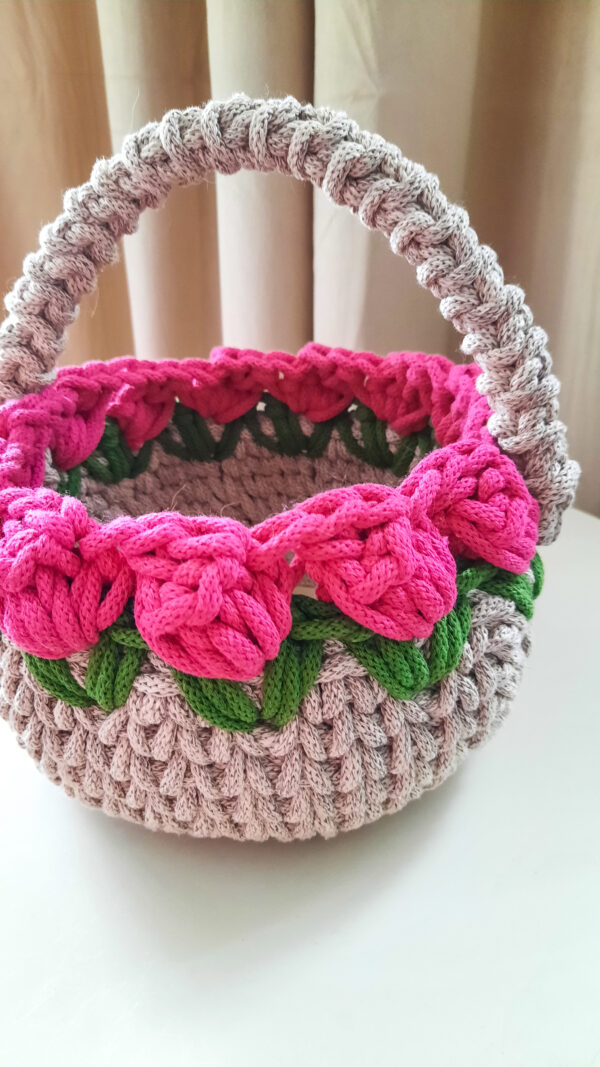 Wielkanocny Koszyk Szydełkowy ze sznurka ozdobiony Tulipanami