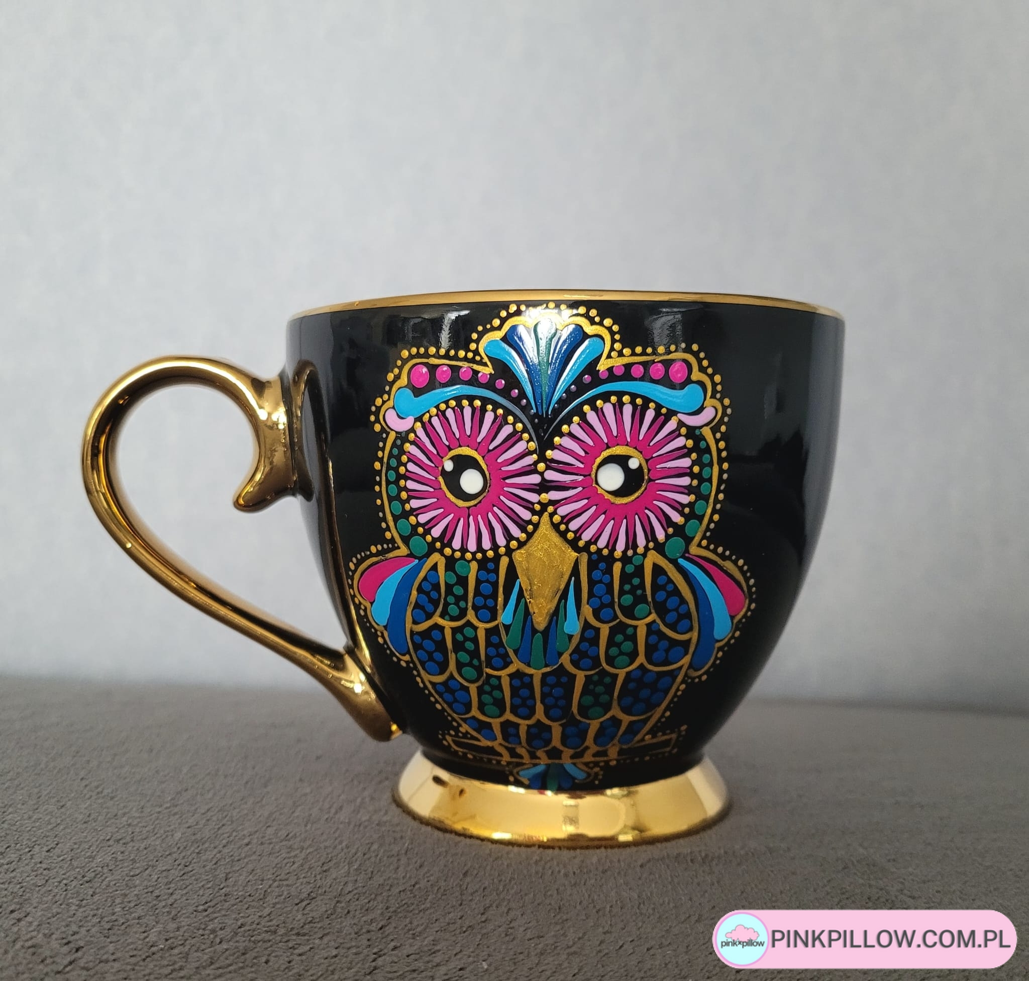 Elegancki, kubek dla Nauczyciela czarno-złoty z kolorową sową, o pojemności 400 ml, zdobiony ręcznie techniką Dot Art. Wzór nanoszony ręcznie metodą dot painting specjalnymi farbami przeznaczonymi do malowania szkła i porcelany. Całość wypalana, dla utrwalenia wzoru i nadania mu odporności. Kubek sprawdzi się jako prezent dla nauczyciela lub wychowawcy na zakończenie roku szkolnego.