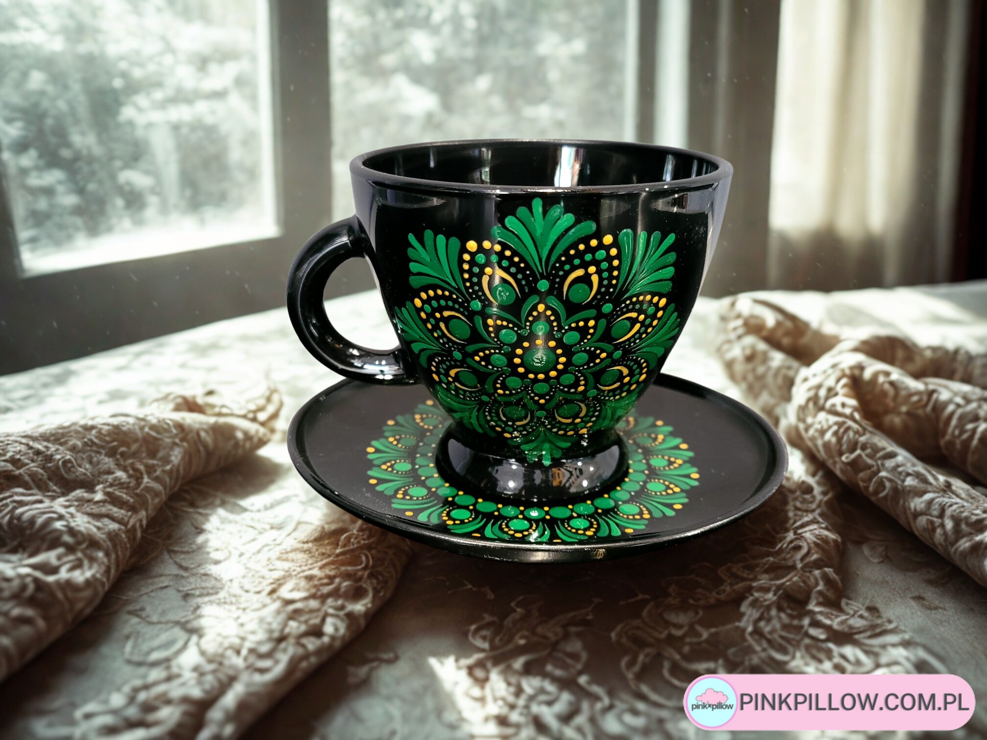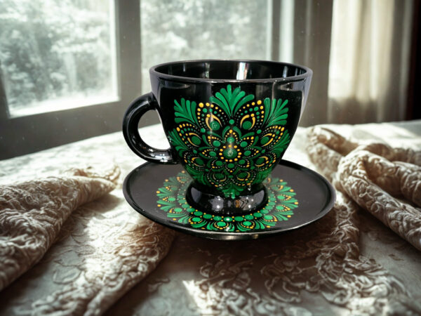 Nałożony ręcznie wzór mandali w kolorach przecudnej zieleni podkreśla jej urok. Farba, która została użyta może mieć kontakt z żywnością i gorącymi napojami, ponieważ jest przeznaczona do malowania szkła i porcelany. Można myć w zmywarce, ale tylko programem do mycia szkła.