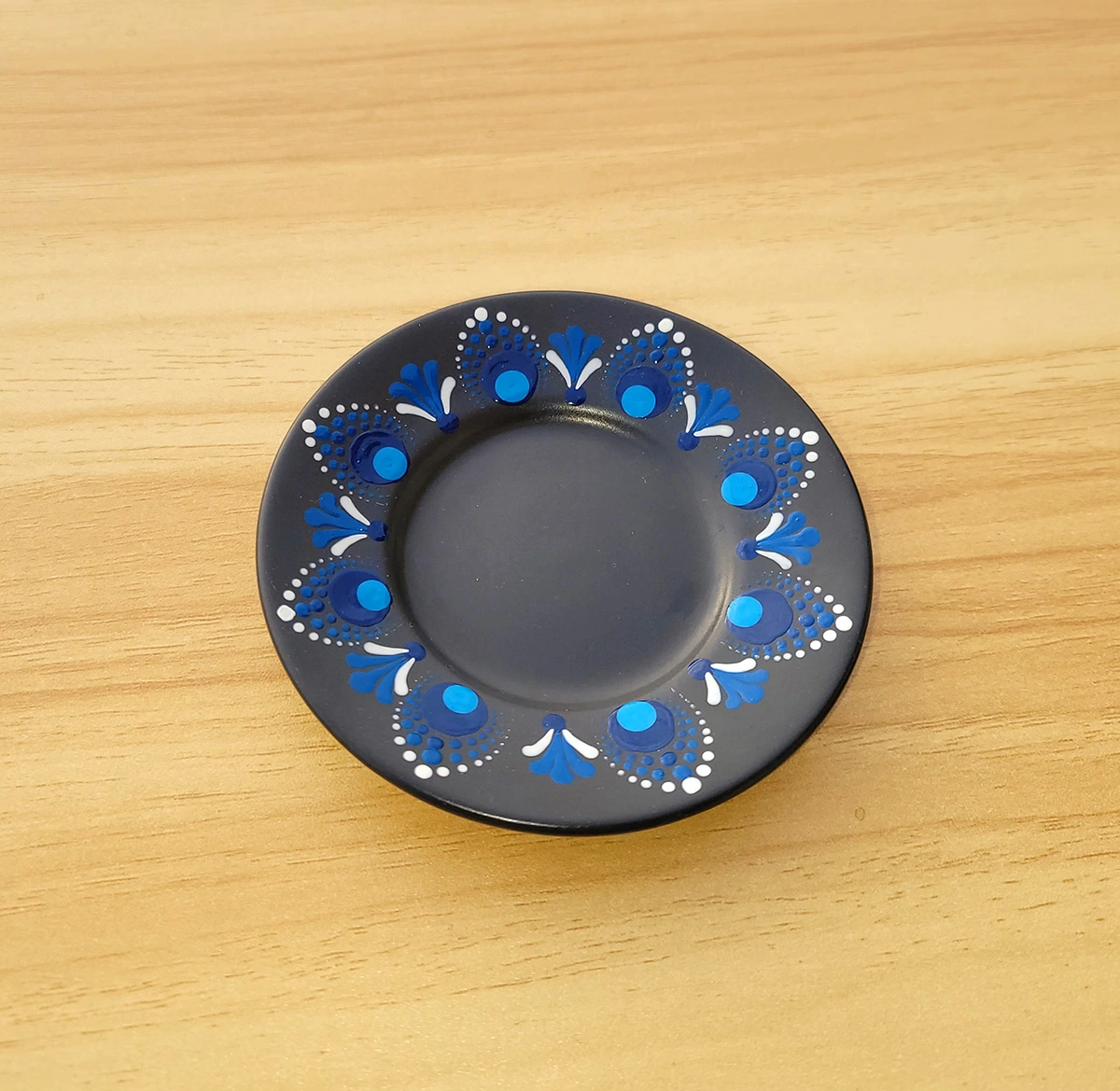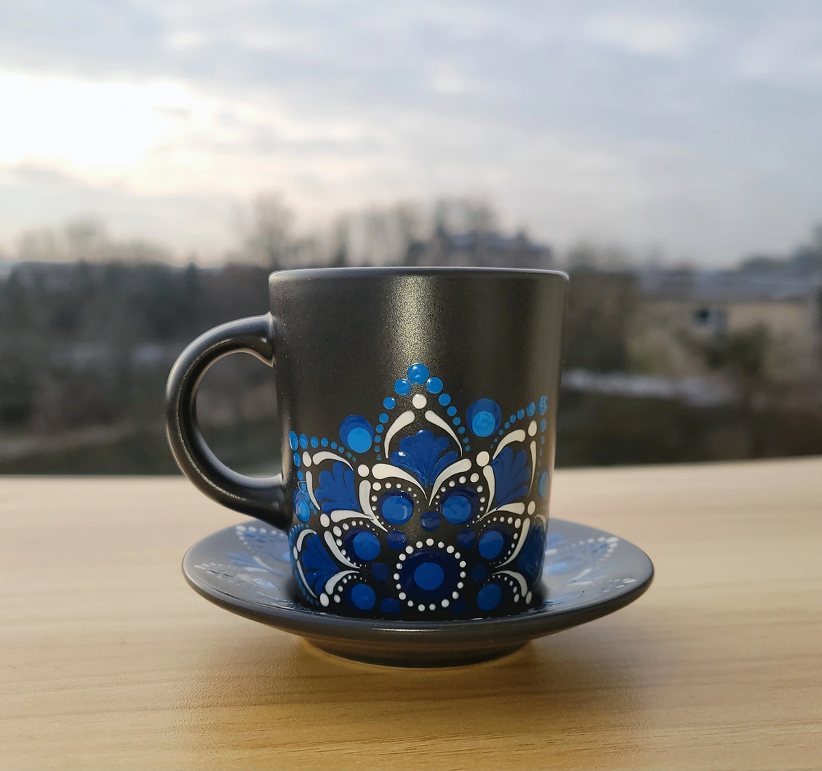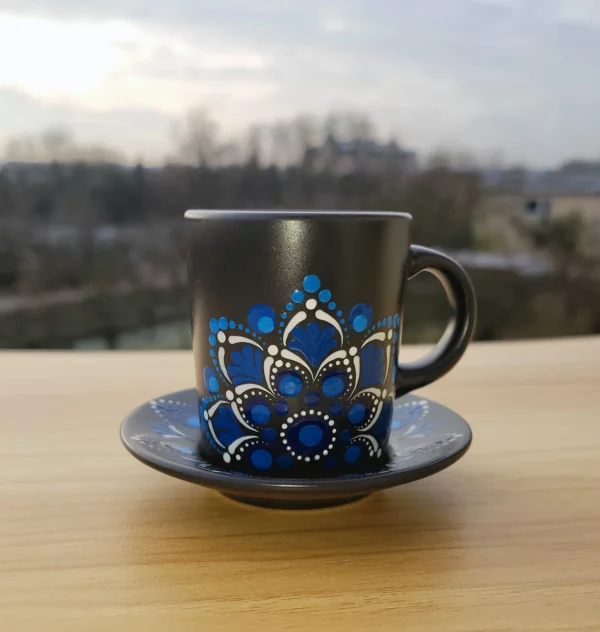 Ręcznie malowany Kubek na Kawę typu Espresso o pojemności 90 ml, w komplecie z ozdabianym Talerzykiem. Całość dekoracji wykonana jest ręcznie techniką Dot-Art. Wzór zdobienia to Mandala Niebiesko-Biała. Malowanie wykonane specjalną farbą do malowania szkła i porcelany, które dla trwałości jest dodatkowo wypalane. Farba może mieć kontakt z żywnością i gorącymi napojami. Nie zaleca się mycia w zmywarce.