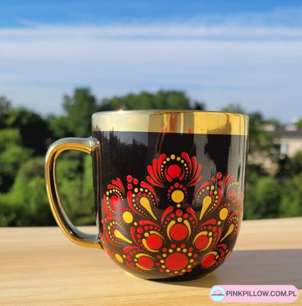 Kubek ozdobny, porcelanowy malowany ręcznie metodą dot painting w Czerwono-Złote Mandale. Ozdobienia wykonane specjalnymi farbami przeznaczonymi do malowania szkła i porcelany. Farba ta może mieć kontakt z żywnością i gorącymi napojami. Po naniesieniu wzoru kubek został wypalany, co spowodowało, że farba jest utrwalona i podczas mycia wzór nie zostanie naruszony.