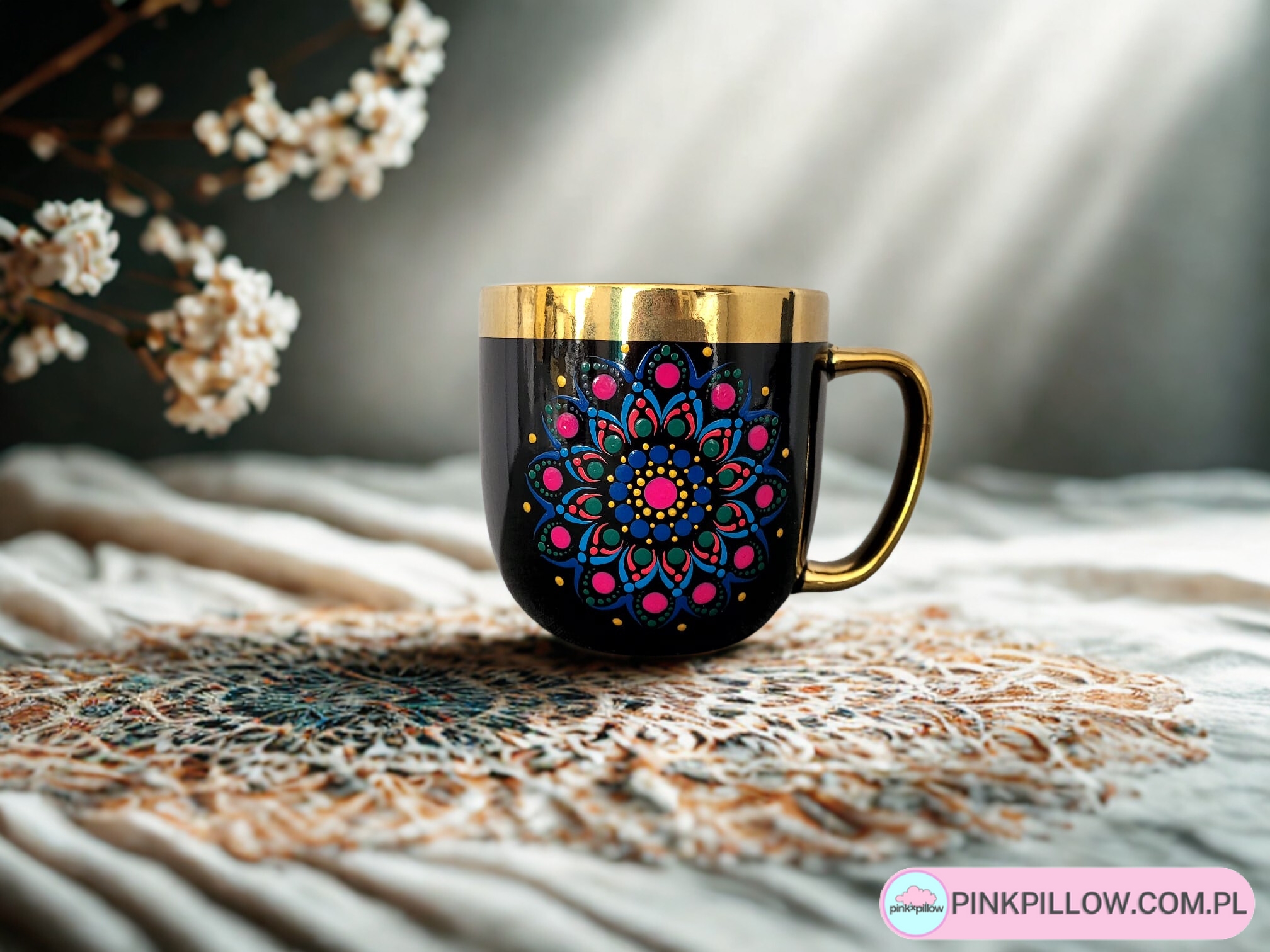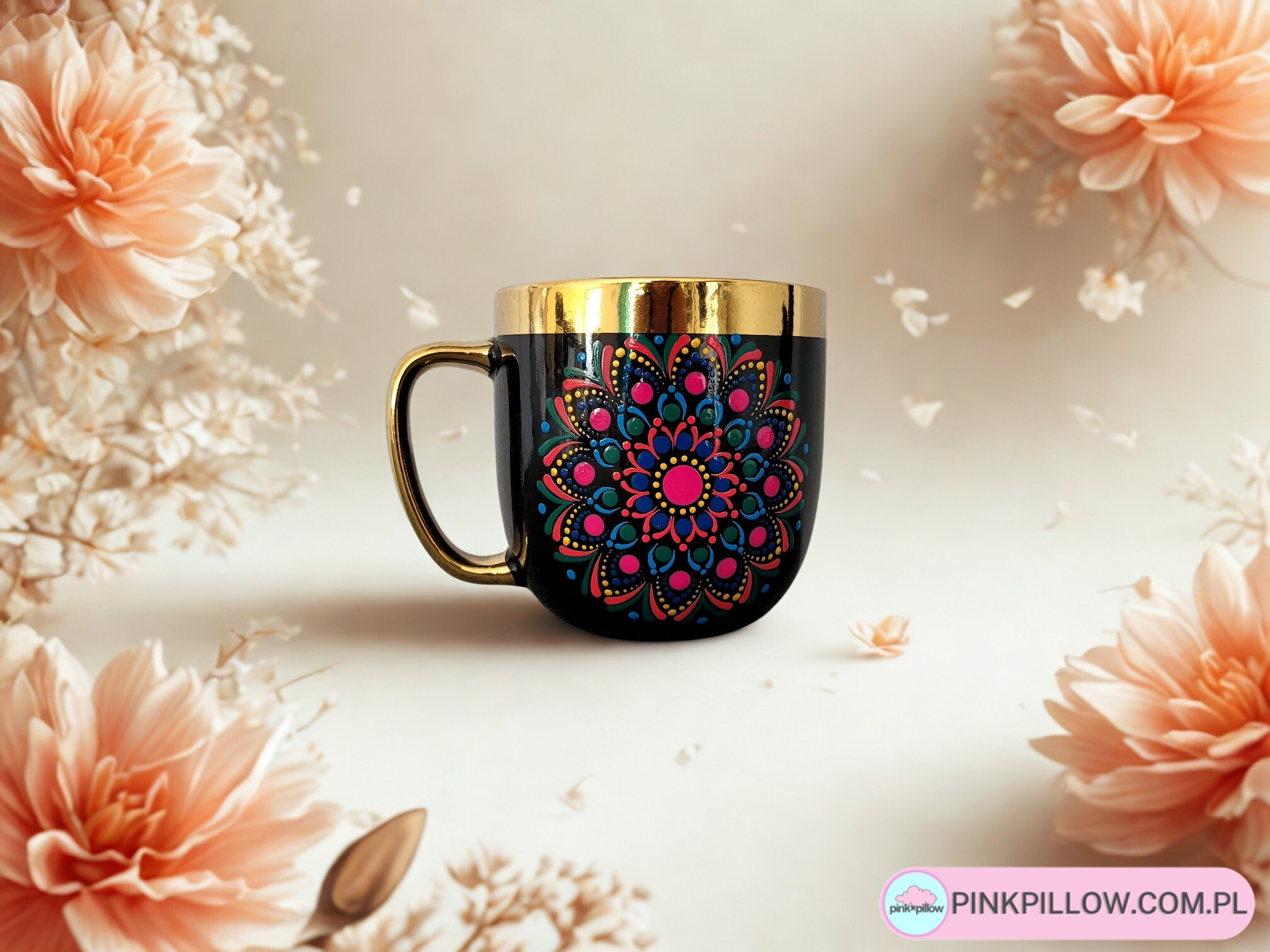 Kubek prezentowy, zdobiony w pastelową mandalę, naniesioną na czarny kubek za pomocą farb, techniką dot art painting. Wzór trwały, specjalnie wypalany. Kolorowa mandala pięknie komponuje się z kolorem kubka, czarnym ze złotą obramówką. Farba ta może mieć kontakt z żywnością i gorącymi napojami. Po naniesieniu wzoru kubek został wypalany, co spowodowało, że farba jest utrwalona i podczas mycia wzór nie zostanie naruszony.
