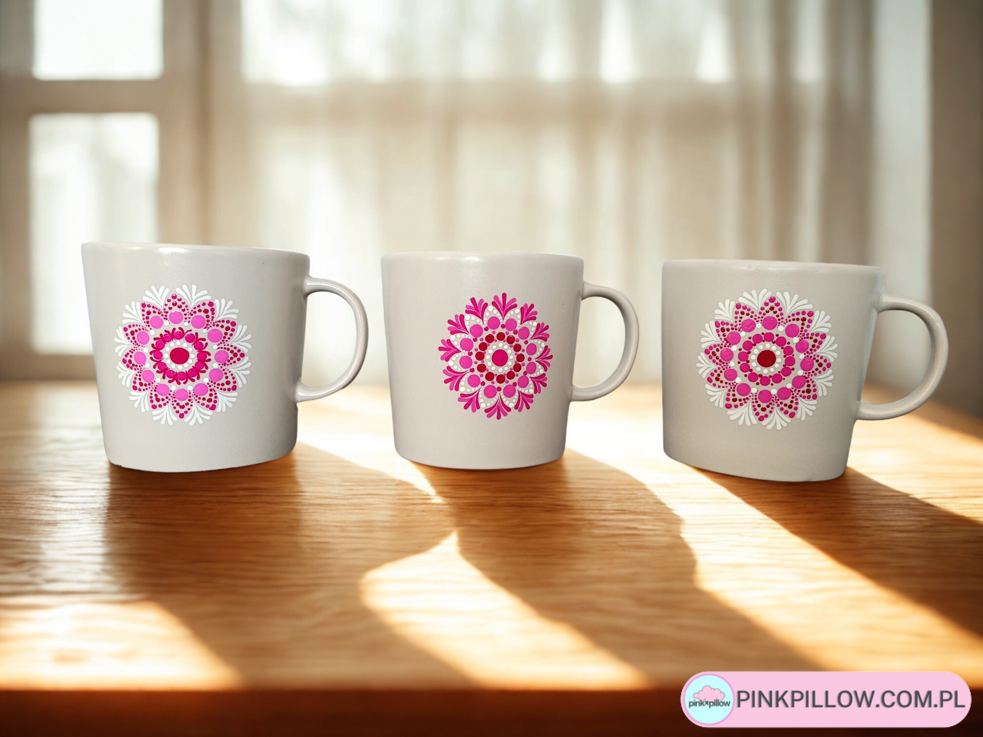 Kubek Rękodzieło z matowej kamionki w kolorze beżowym został ręcznie ozdobiony Mandalą w kolorach fuksji z dodatkiem bieli.