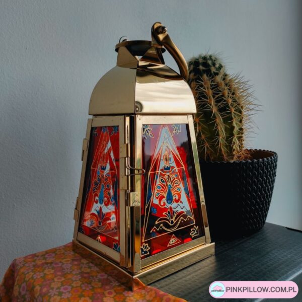Jedyna w swoim rodzaju latarnia / lampion z ręcznie malowanymi panelami witrażowymi. Inspirowany hipnotyzującym pięknem sztuki bliskowschodniej. Zawiera unikalne geometryczne wzory i w samym centrum Paw