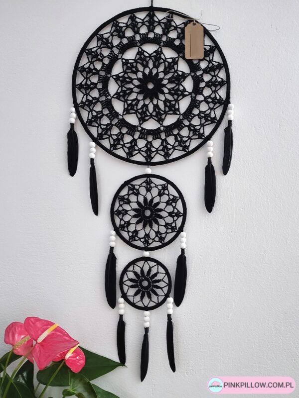 Piękny łapacz snów o długości ok. 60 cm, zdobiony długimi piórami i drewnianymi koralikami. Tworzony jest ręcznie przez naszą rękodzielniczkę z bawełnianego kordonka. Składa się z trzech obręczy o średnicach 25 cm, 12 cm oraz 8 cm. Na życzenie klienta łapacz snów może posiadać dowolny kolor. Łapacz snów pięknie prezentuje się w salonie, sypialni, przedpokoju oraz w innych wnętrzach, będąc ciekawą, niespotykaną i oryginalną dekoracją.