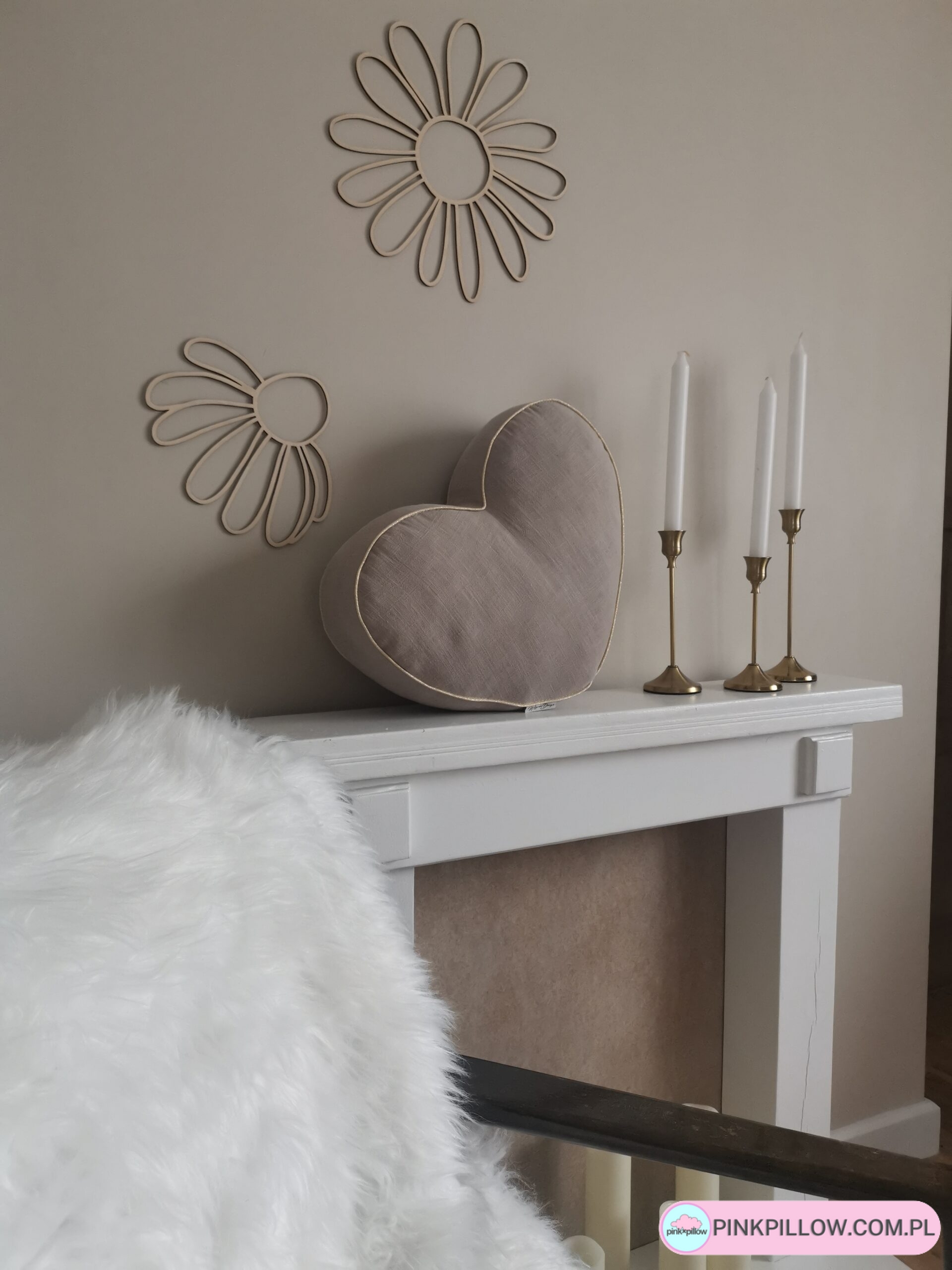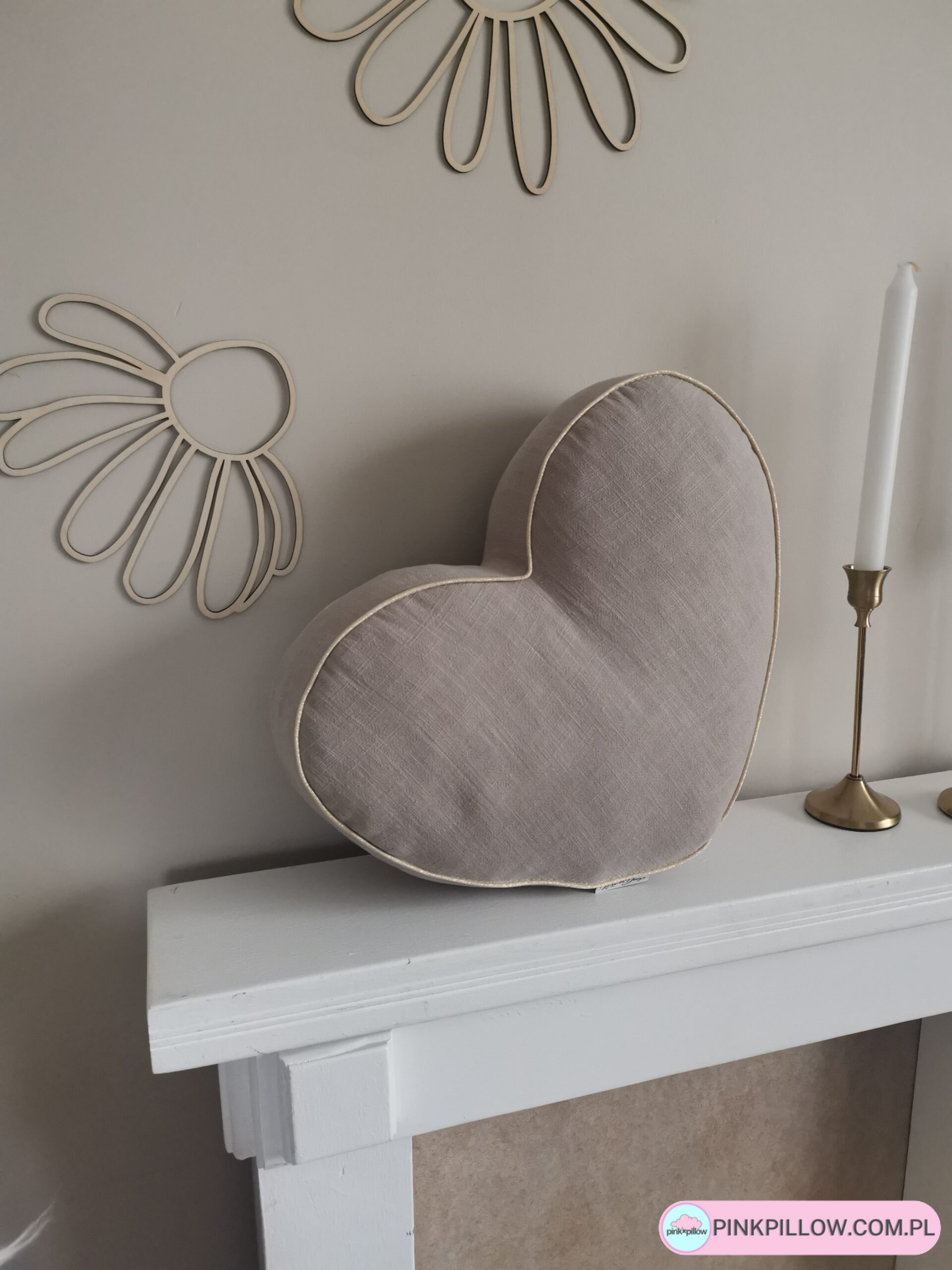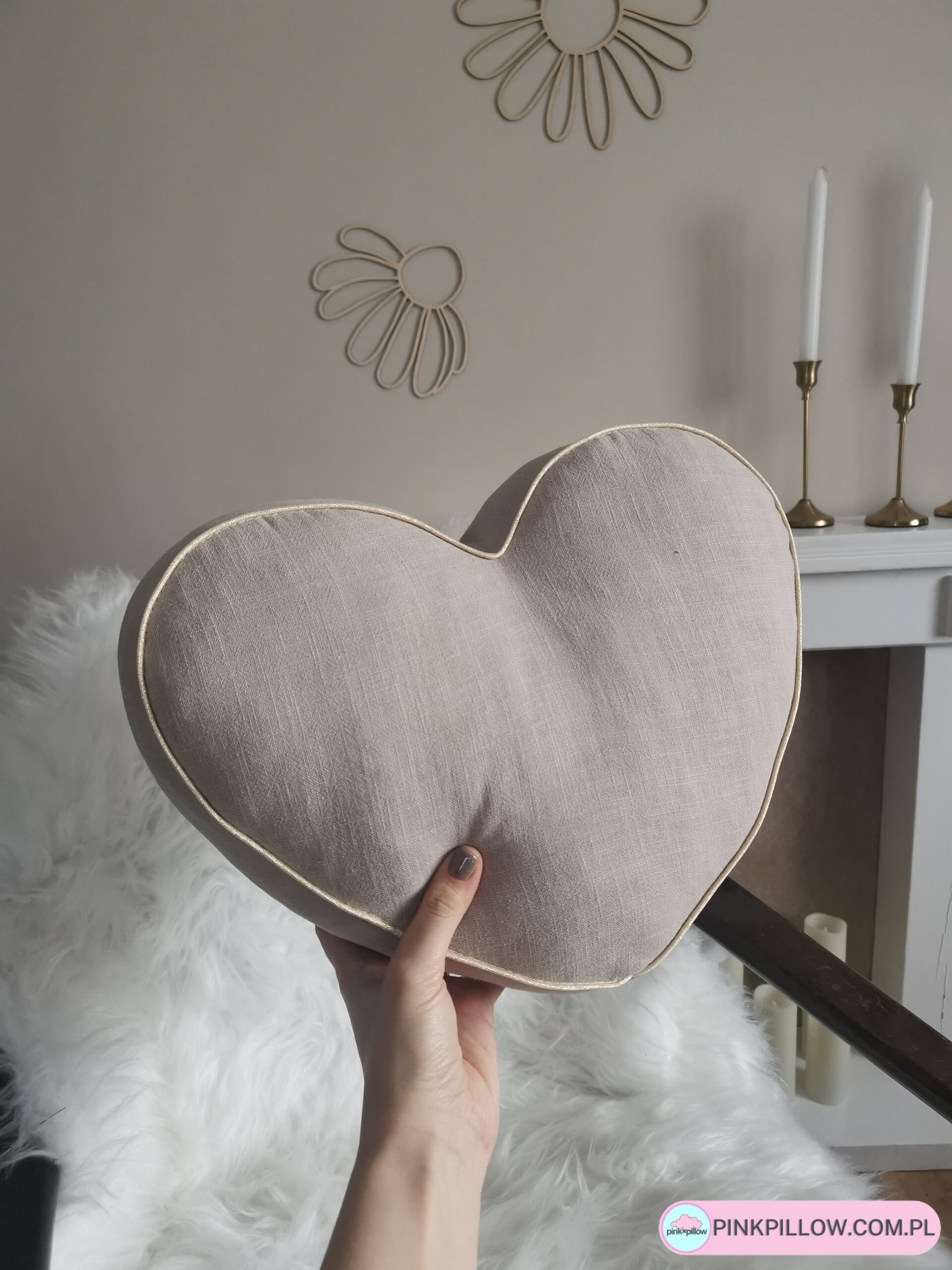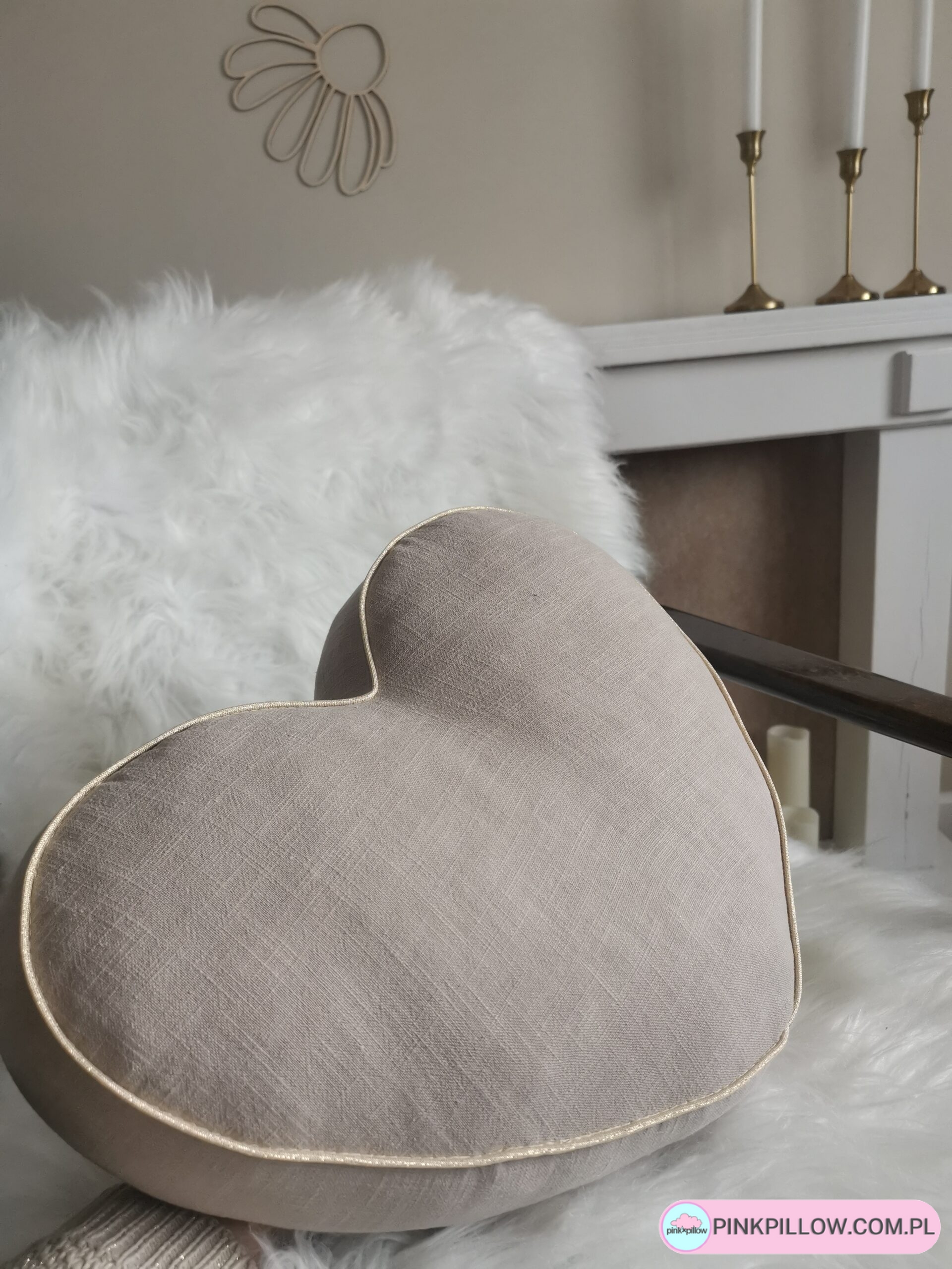 Dodaj odrobinę elegancji i naturalnego uroku do swojego wnętrza dzięki tej wyjątkowej poduszce w kształcie serca. Wykonana z wysokiej jakości lnu, który zapewnia przyjemną miękkość, a zarazem trwałość. Poduszka jest idealnym akcentem zarówno do salonu, jak i sypialni. Subtelna złota lamówka dookoła krawędzi nadaje jej wyjątkowego charakteru, wprowadzając do przestrzeni odrobinę luksusu.