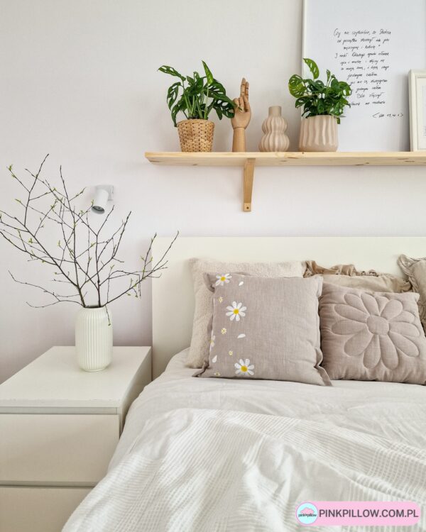 Haftowana, kwadratowa poduszka z motywem kwiatków Stokrotek i Margaretek. Wykonana z lnu w kolorze beżowym z dodatkiem stylowego przeszycia wokół. Produkt jest interesującą propozycją na prezent dla dziecka, osoby dorosłej, jak również stanowi ciekawe uzupełnienie wystroju pokoju miłośnika kwiatów, natury i nie tylko. Idealna ozdoba do pokoju w stylu skandynawskim, boho, czy organicznym.