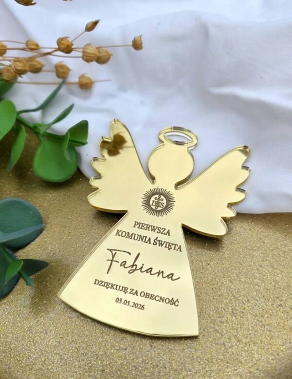 Lustrzane Podziękowanie/Magnes dla gości na Komunie, Chrzest – Złoty Anioł Stróż