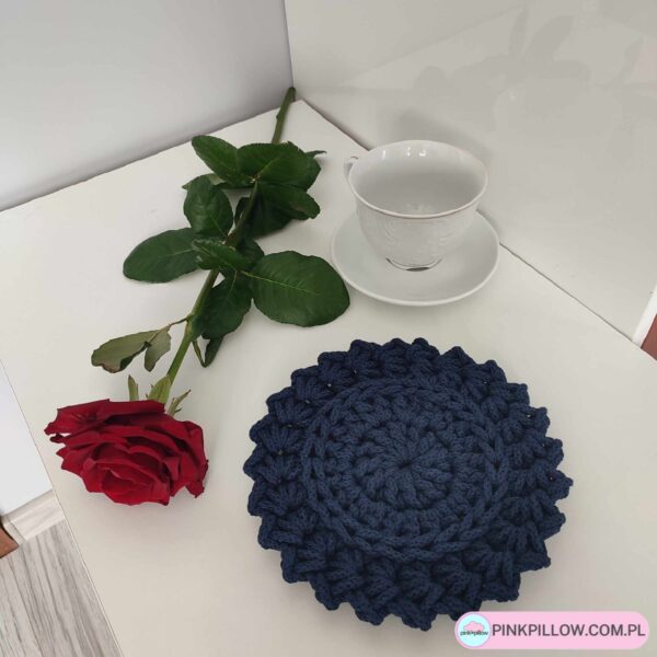 Podkładka okrągła o średnicy 20 cm, wykonana ręcznie metodą szydełkowania z polskiego sznurka bawełnianego o grubości 5 mm. Przepiękny wzór podkładki, która z pewnością będzie ozdobą każdego stołu lub stolika kawowego. Sprawdzi się na stół pod kubki, szklanki, filiżanki oraz kieliszki. Podkładka jest gruba, dzięki czemu zabezpieczy każdy blat. Możliwość wykonania podkładki również w innych kolorach (cała paleta kolorów znajduje się poniżej).