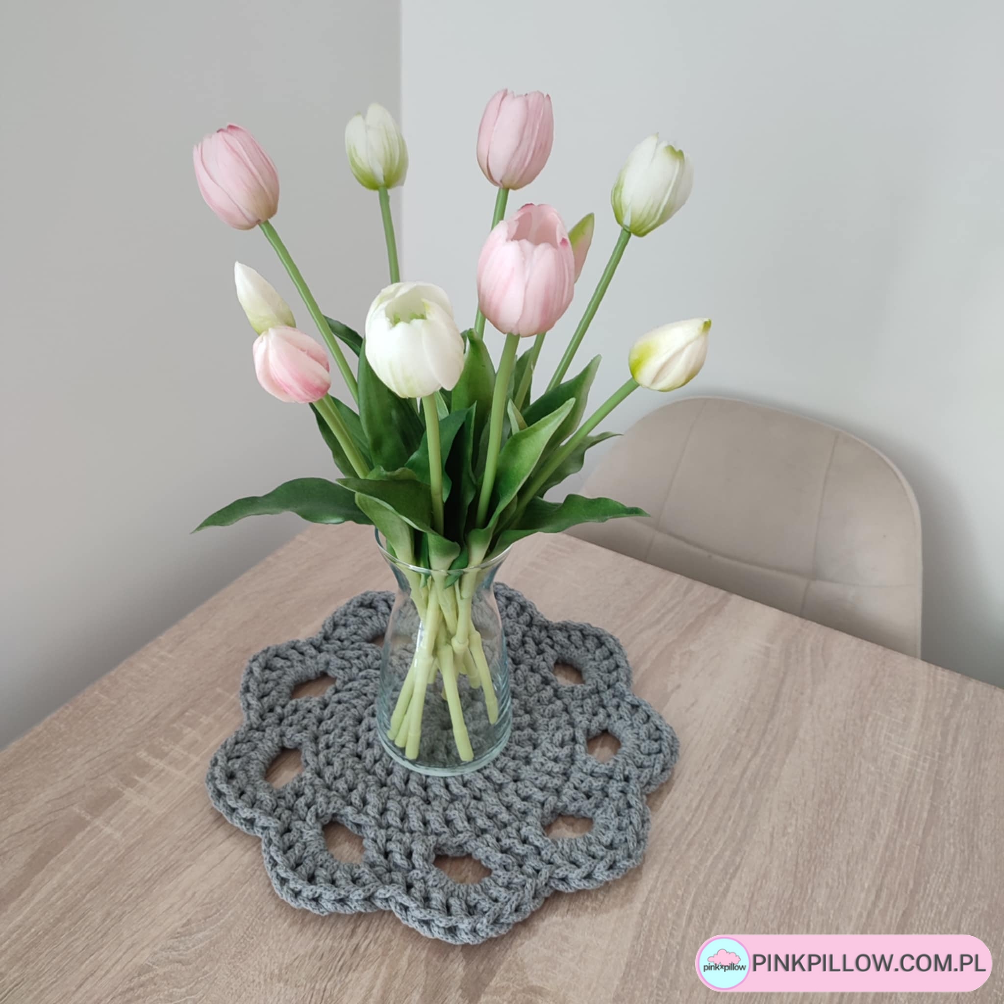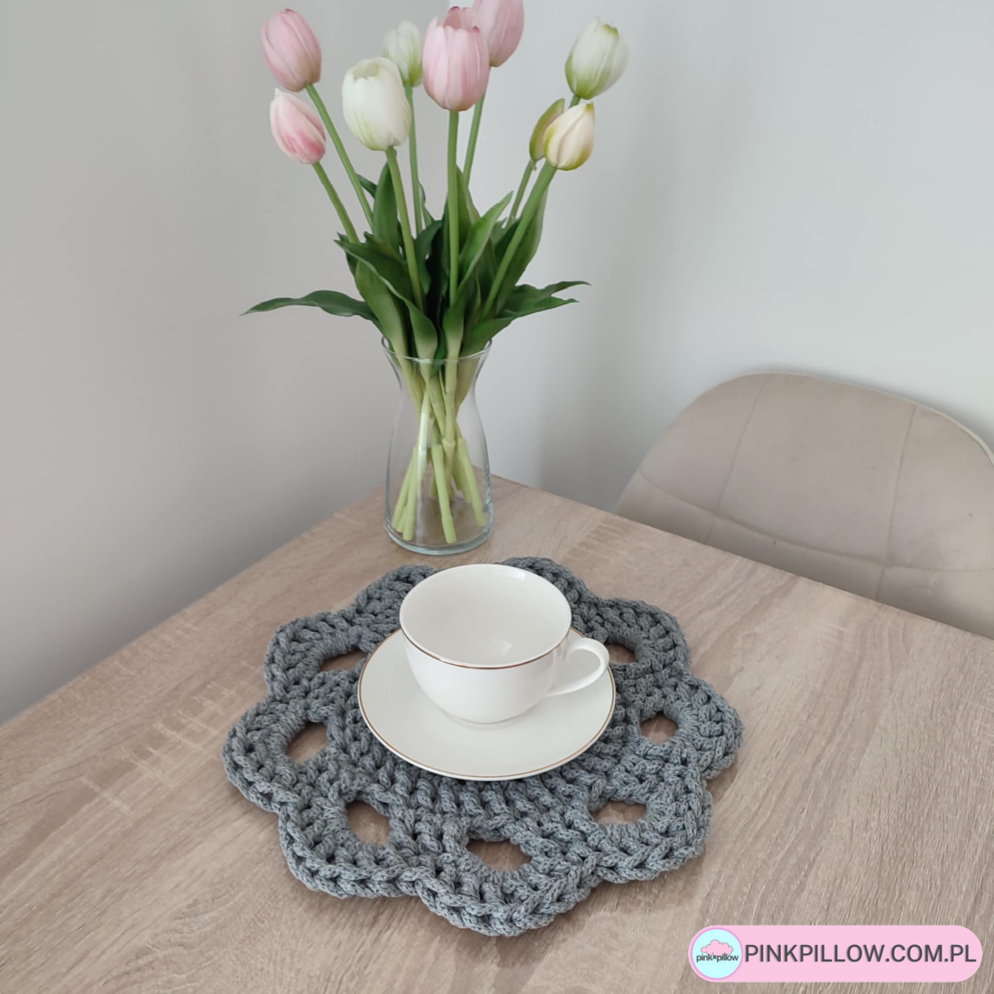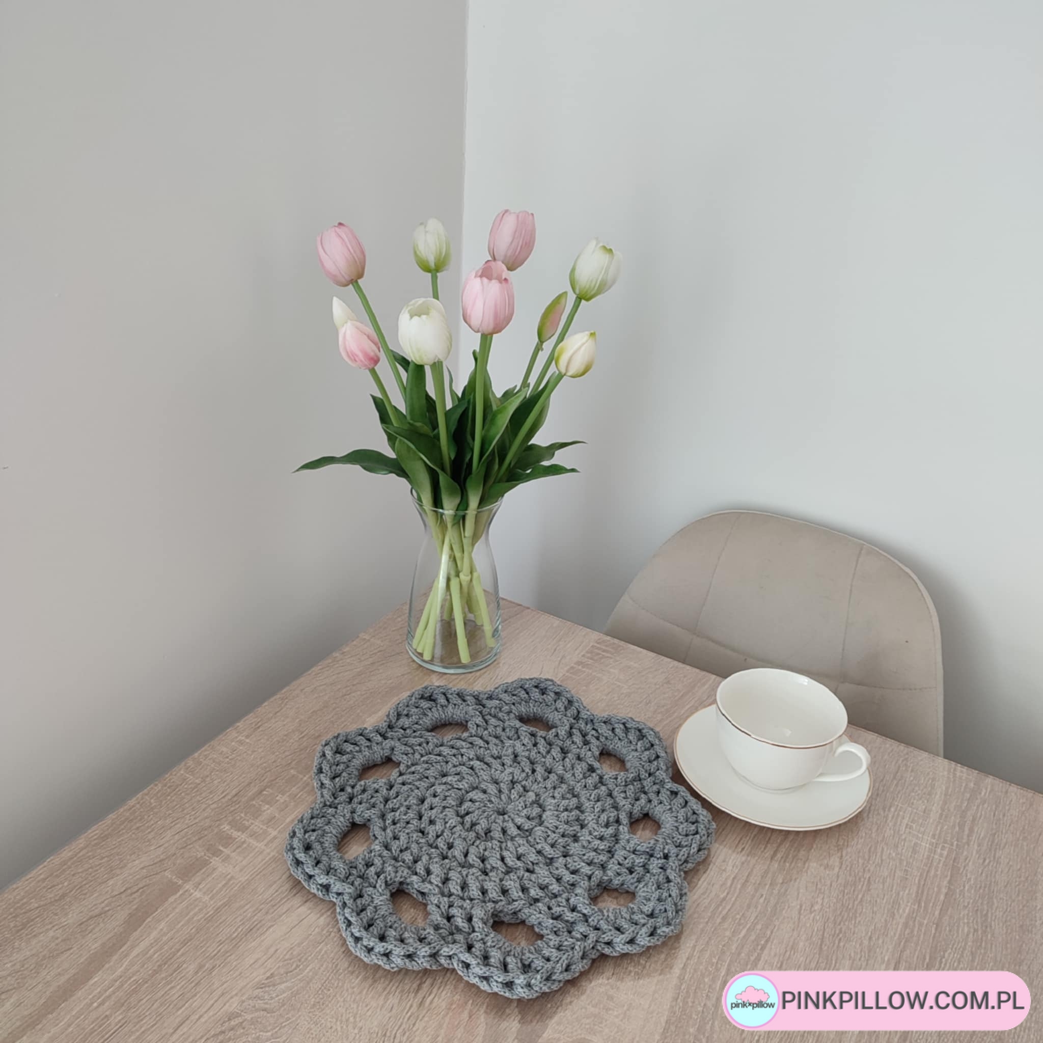 Mała Podkładka o średnicy 30 cm, wykonana na szydełku ze sznurka bawełnianego 5mm polskiej produkcji. Świetna pod talerze lub kubki na duży stół lub mniejszy stolik. Podkładka jest łatwa w utrzymaniu w czystości, ponieważ można prać w pralce w 30 stopniach i wirować. Suszyć należy rozłożoną na płasko.