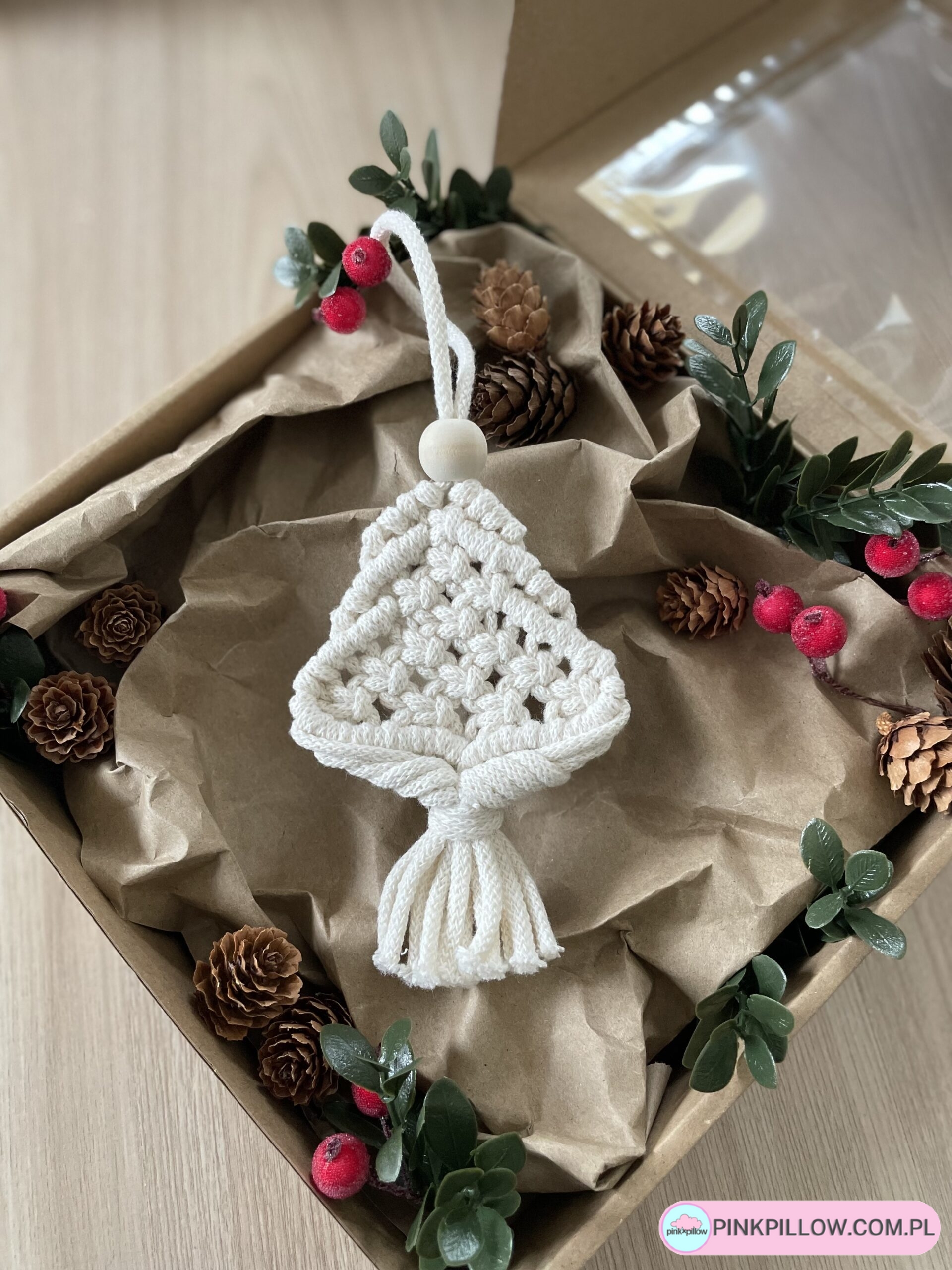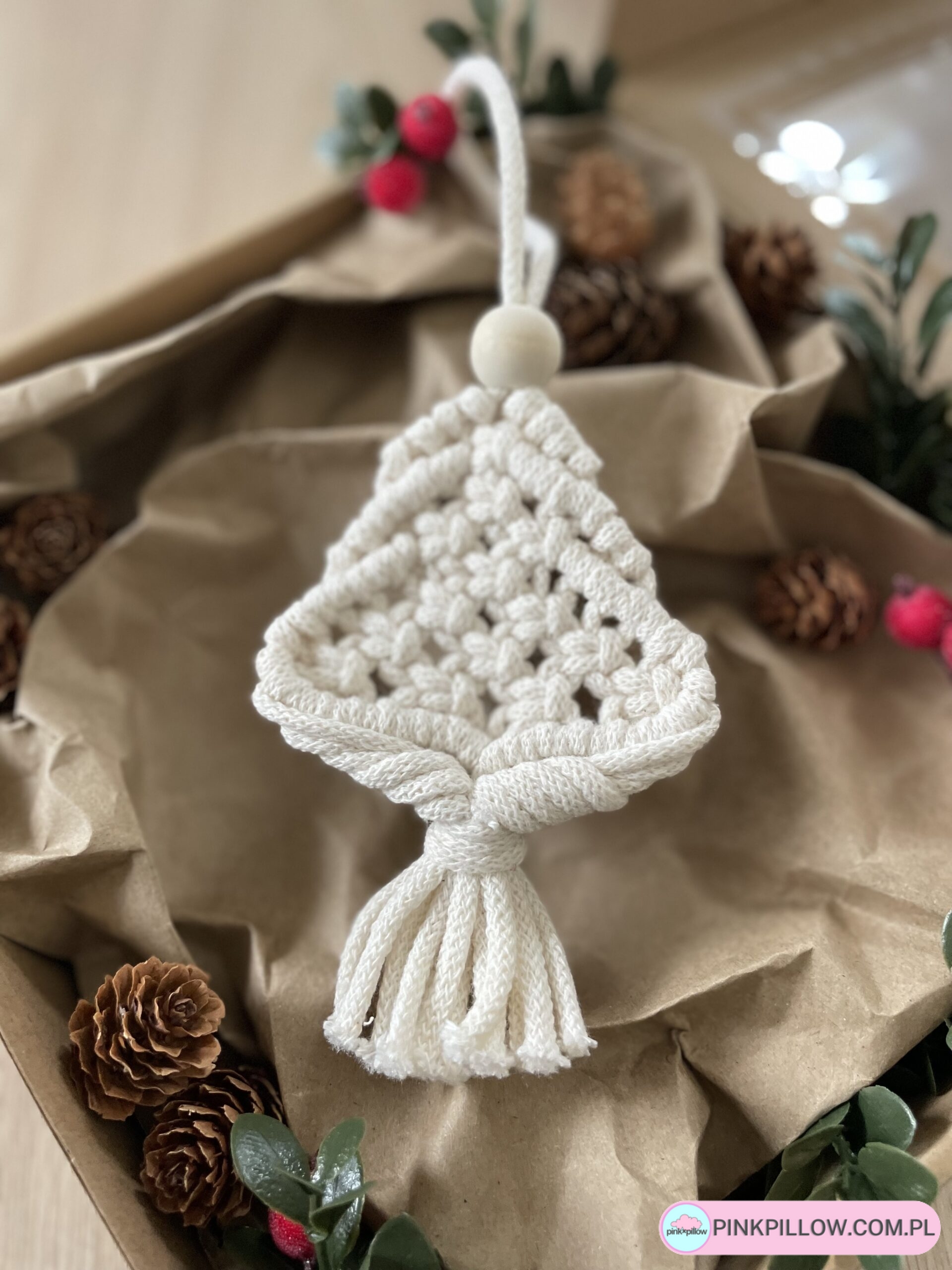 Ręcznie wykonana mała zawieszka w kształcie choinki, stworzona ze sznurka bawełnianego w kolorze Ecru. Staranny, pleciony wzór oraz dekoracyjny chwost nadają jej lekkości i subtelnego, naturalnego charakteru. Drewniana kulka dopełnia całości, podkreślając styl boho i dodając elegancji.