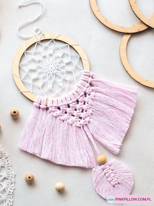 Ręcznie pleciony mały łapacz snów o długości całkowitej około 28 cm. Tworzony przy pomocy szydełka w połączeniu z techniką makramy. Wypełnienie wewnątrz okręgu tworzone jest z cienkiego kordonka, natomiast dolna część z grubszego sznurka bawełnianego. Łapacz zapleciony jest na drewnianej obręczy o średnicy 12 cm. Dekoracja zdobiona jest na dole luźno rozplecionymi sznurkami, malutkim listkiem oraz drewnianym koralikiem. Łapacz sprawdzi się jako dekoracja do wnętrza domu lub mieszkania, jak również jako amulet do samochodu bądź plecaka.